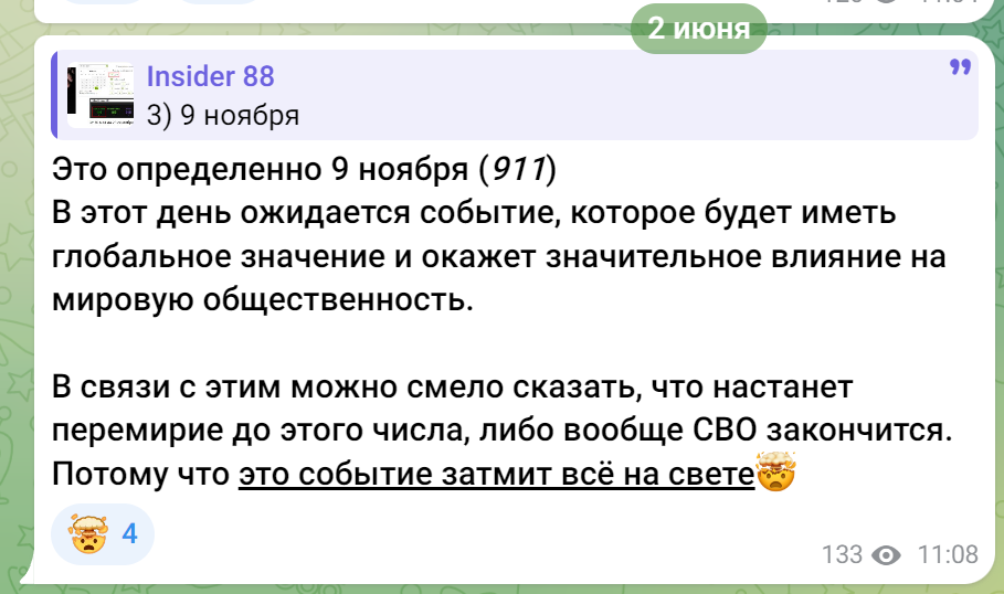 >>906216 Доказательства того, что Сатоши пиздит инфу у инсайдера 88. Он изначально выставляет много маркеров и, если какие-то сбылись, преподносит их как что-то невообразимо точное. А что не сбывается, он про это замалчивает. В этом примере он выставил 11 лампочек, спиздив идею у инсайдера, потому что тот сразу сказал, что перемирие будет в ноябре, то есть в 11 месяце.