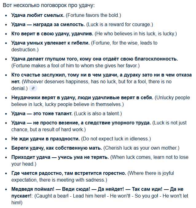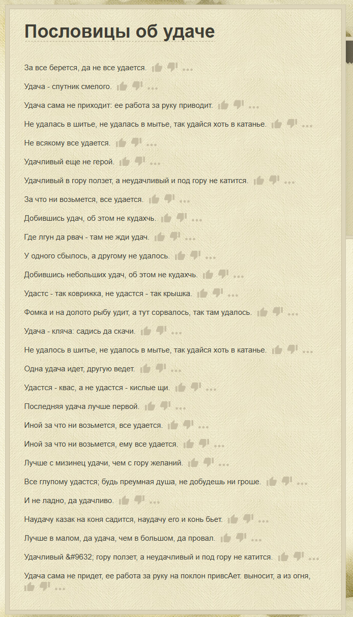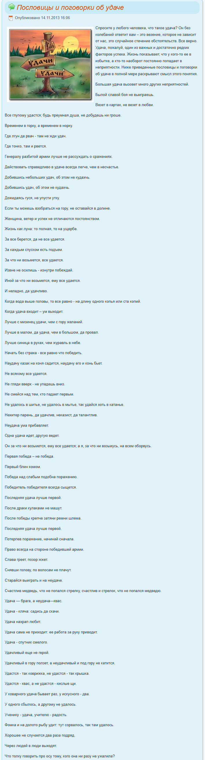 - кто много смеётся - слезами умоется - хочешь мира - готовься к войне - ничего не предвещало беды, но ... - хочешь рассмешить бога - расскажи ему о своих планах - беда не приходит одна - свалилось как СНЕГ НА ГОЛОВУ - всем известная - чёрная и белая полоса - что за хвост синей птицы удачи? и почему она синяя? - с каких пор подкова это символ удачи? почему не лапоть или не балалайка? - новичкам везёт - случайность - подпись бога - не дели шкуру неубитого медведя