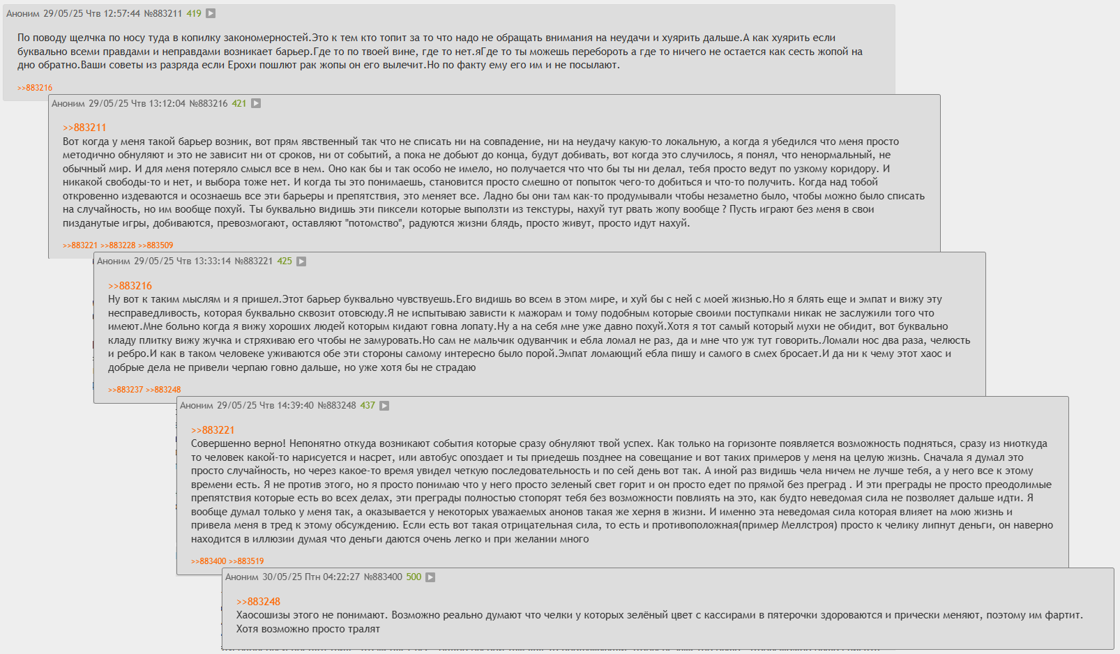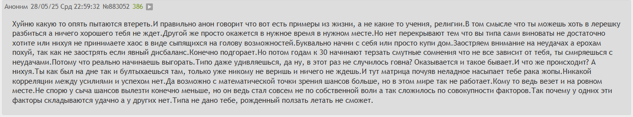 Сам являюсь неудачником. Но есть очень успешные друзья с которыми общаемся много лет уже. У них пиздатые машины, девушки, бабки и здоровье. Так вот они нахуй этим ничем не интересуются, а наоборот даже посмеиваются когда я нечто подобное хотя бы приблизительно пытаюсь рассказать. В этом и парадокс. Причем даже они признают в итоге что мне как то подозрительно не везет всю жизнь, за чтобы я не брался а попыток было бесчисленное множество. Типо даже они грубо говоря люди не особо интересующиеся всем таким говорили что на мне какая то хуйня типо проклятье. И я понимаю что я не пуп земли и так далее. Что в треде таких дохуя как я. Но просто забавная закономерность. Может стоит сделать себе лоботомию или хуй знает. Чтобы не пытаться думать об этом всём а просто жить жизнь. Делать ЧО ПО КАЙФУ.