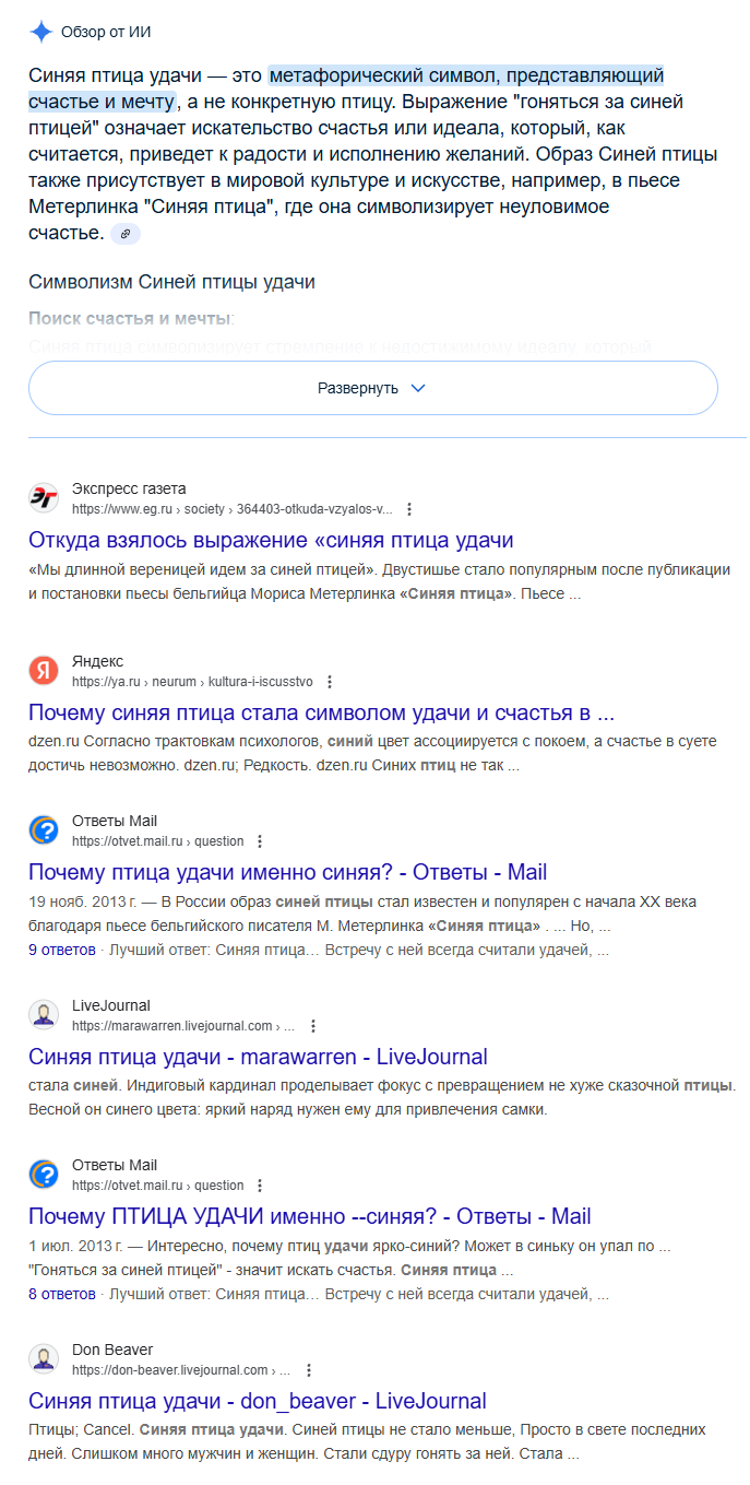 >>911010 Ты сам уебище бездарное. Про синюю птицу удачи все знает. Но как она вписывается в тему треда? И почему она синяя? Поймал удачу за хвост, тут может тоже птица? Я короче хз, аноны давайте еще мнения.