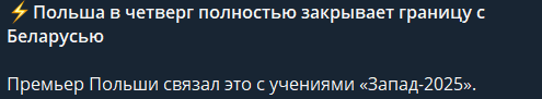 >Польша в ночь с 11 на 12 сентября полностью закроет границу с Белоруссией в связи с проведением российско-белорусских учений «Запад-2025».