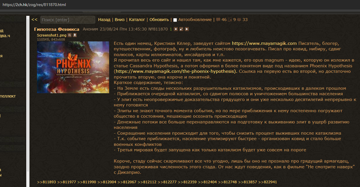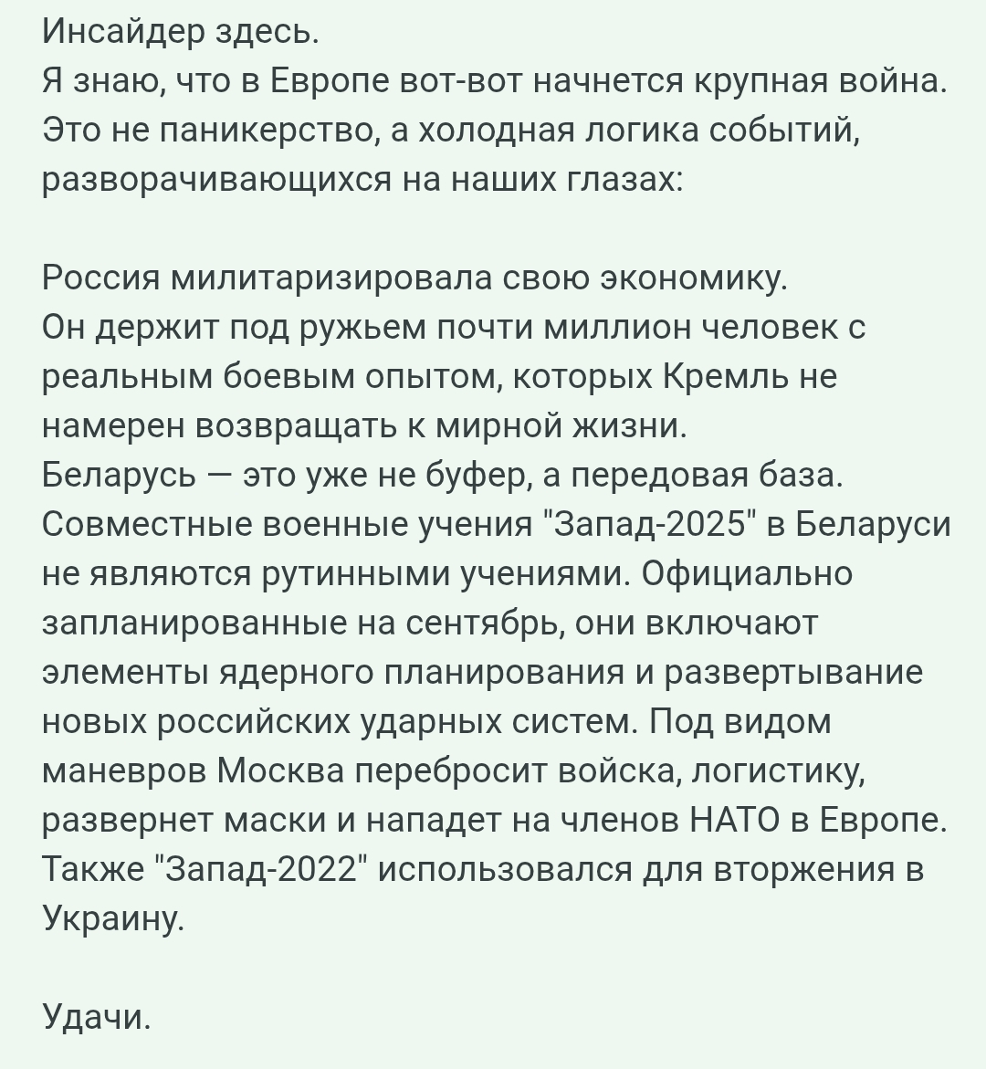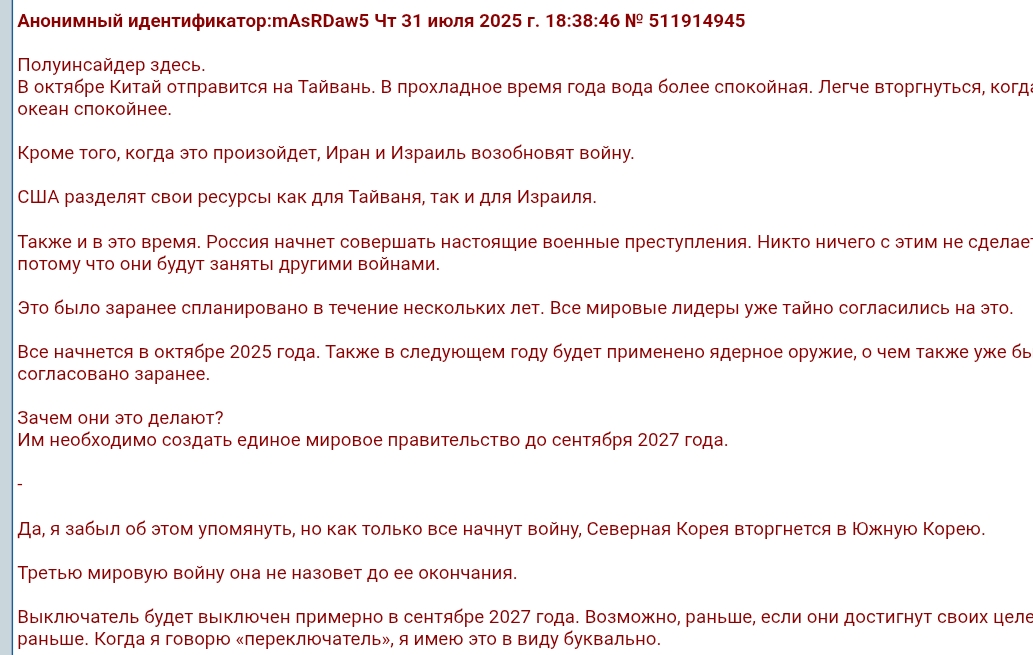 >>912677 Этот шарит. Двачеры, ну действительно, вся это возня в мире напоминает не только и не столько подготовку к 3мв, сколько подготовку к возможно еще чему-то. Например природному катаклизму. Смотрели фильм Столкновение с бездной? Так вот там, по сюжету, американское правтельство скрывало довольно долго и довольно успешно (буквально, на сколько помню, оставалось что-то в районе 6-10 месяцев до падения метеорита и только тогда журналистка таки догадалась, что Елли, по легенде псевдолюбовница одного из топчиновников, на самом деле Еффект Лавинного Истребления (ELE). Власти, и не только США но и других топ-стран, в тихую пилили деньги на укрытия списывая их на всякое очевидно-будничное. Вот эти конференции лидеров ЕС, собрания которые ничего не решают и ничего никуда не двигают в теме эсвэоу. Возможно потому, что они там обсуждают нечто другое? Повторю еще раз из прошлого трэда, вы ранее когда-то выдели лидера которого штырит в прямом эфире? Например, как Меллони? А другие? Неужели все на столько деградировало? А может, просто, будучи в курсе надвигающегося пиздеца они, как бы, и не очень переживают на счет своего авторитета? А сама грандиозная кампания по взятию русскими сел великие залупки и три дубка на аротяжении 1187 серий? Как-то не так все выглядит. Можно сказать "гибнут люди" и "слишком сложно прикрывать эсвэоу подготовку ЕС и РФ к природному пиздецу". А я вот думаю, что не сложно. И, вполне возможно, пронозированные потери кратно превышают потери в эсвэоу. Потому на них и идут, относительно легко. Какие варианты вижу наиболие вероятные: 1. Падение метеорита в атлантику (дату знают точно, от нескольких месяцев до нескольких лет) 2. Смена полусюв (знают примерные сроки и они в пределах месяцев или пары лет) 3. Повышение интенсивности Солнца (постепенное, плавное, в рамках, возможно 5-10-15 лет аж до регулярных поломок электроники и температуры +50-55 летом в широтах Лондона и Москвы)
