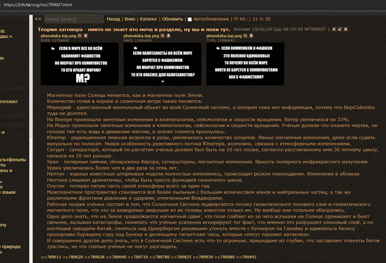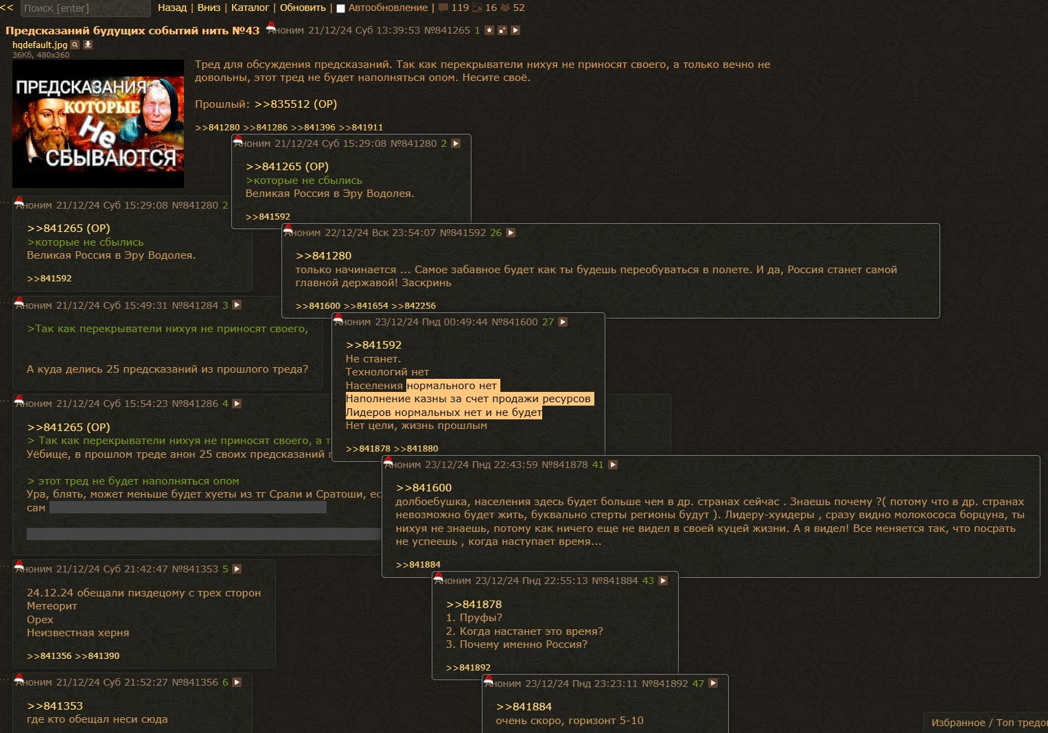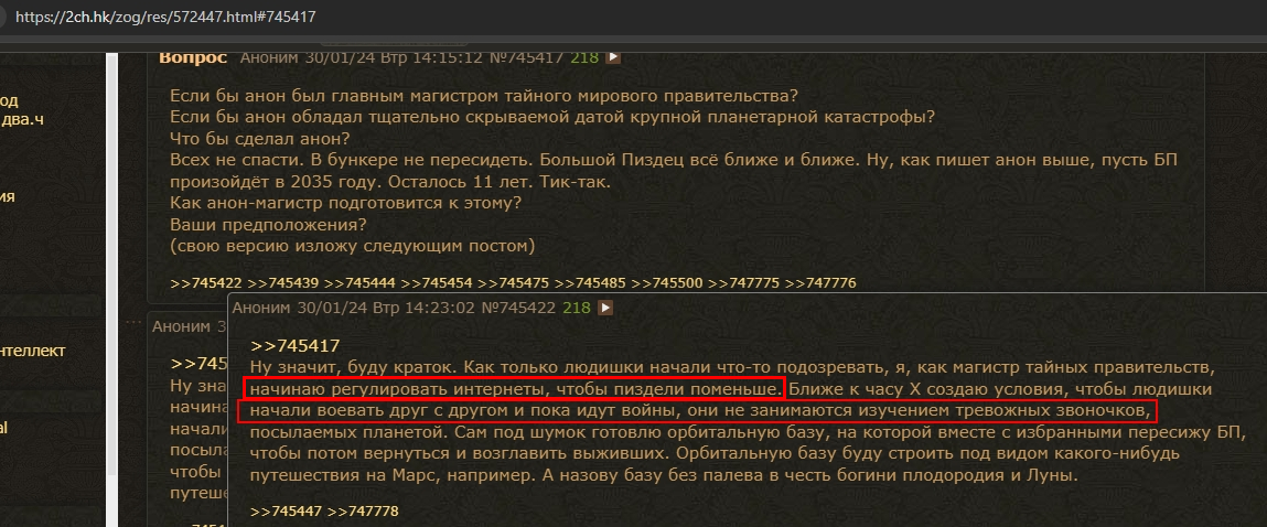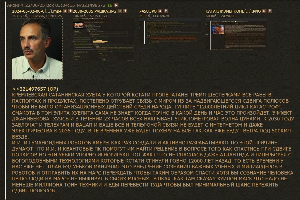 А где шиз, который всех называл скотами и 50 лет назад видел планы рептилойдов по уничтожению России, но гордо остался тут? Может, он нас посвятит, что конкретно нам ждать?