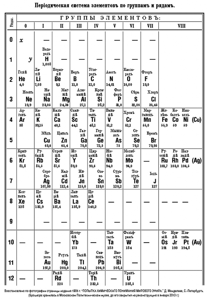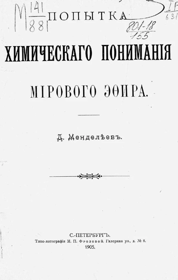 Меделеев поначалу включил Эфир как первый элемент ("х" и "у") в свою таблицу, но потом его оттуда убрали. https://hij.ru/read/15072/