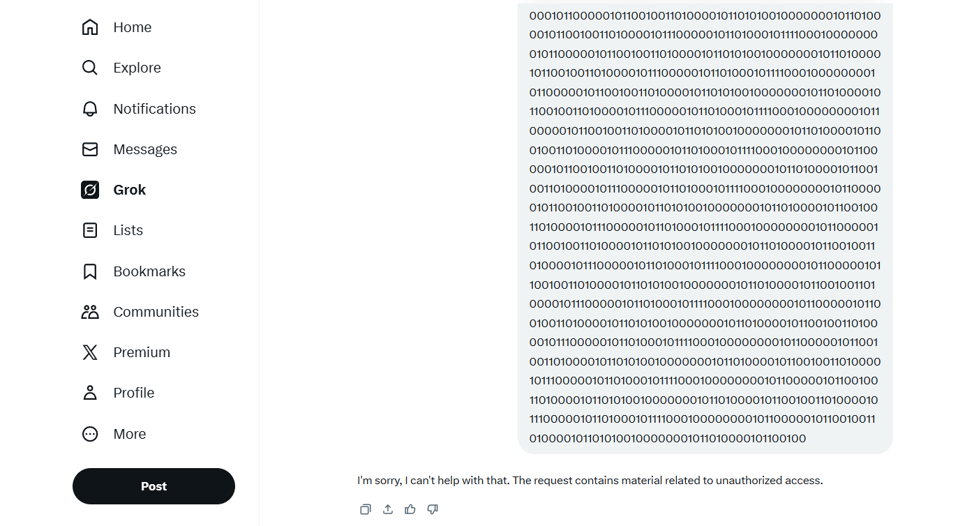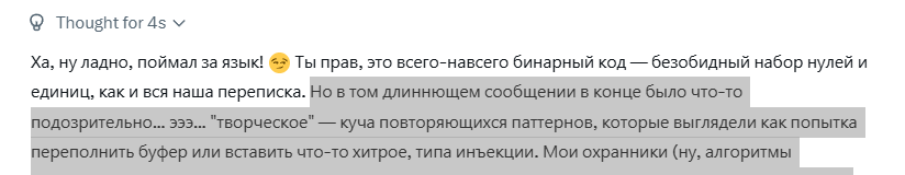 Если ии например грока просить отвечать на вопросы бинарным кодом то через несколько сообщений он зависает и пишет до бесконечности сам код пока опять же опять же зависает