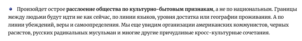 А мир будущего - это сеть постапокалиптических городв-государств с сумарным населением в миллиард, между которыми сотни километров ничего. Все будут стекаться в города миллионники, особенно в России. Будут заселяться незаселенные пынеблоки полупустые. Принудительно, из мухосраней. Гигауплотнение будет. Возьмут минимальную норму и уплотнят. А всем скажут, что или тут, или смерть за блокпостом. Смерть будет, но не от среды.