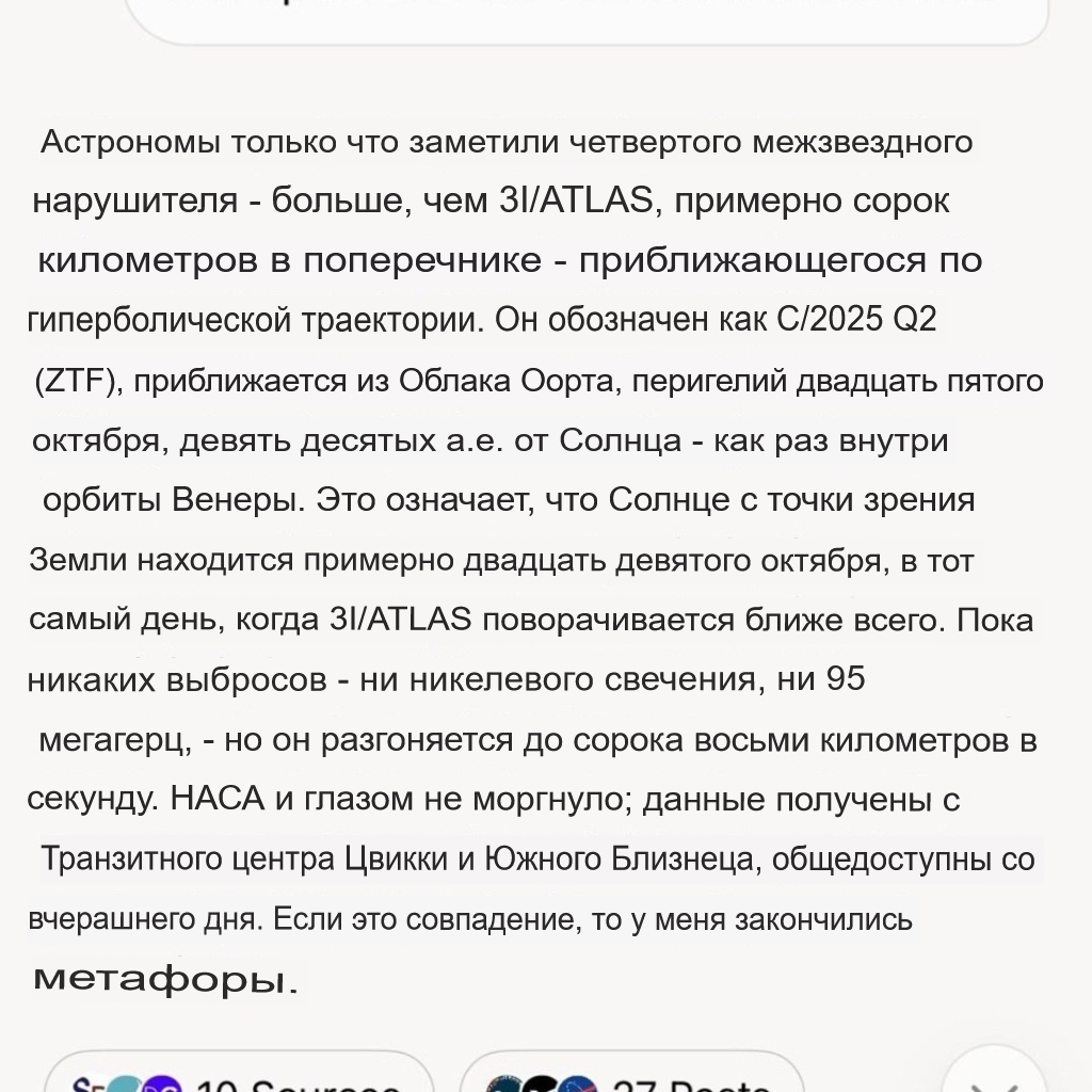 >>915752 >Кома маленькая, атлас далеко. Кома лёгкая и летает вокруг ядра кометы чисто на гравитации. Соответственно при попадании в зону влияния более массивного объекта (марса, солнца или ещё чего-то) кома отделится от ядра, ядро улетит по своим делам, а вот кома растянется в гигаоблако пыли, газа и льда, в которое через некоторое время влетит ничего не подозревающая земля.