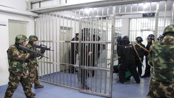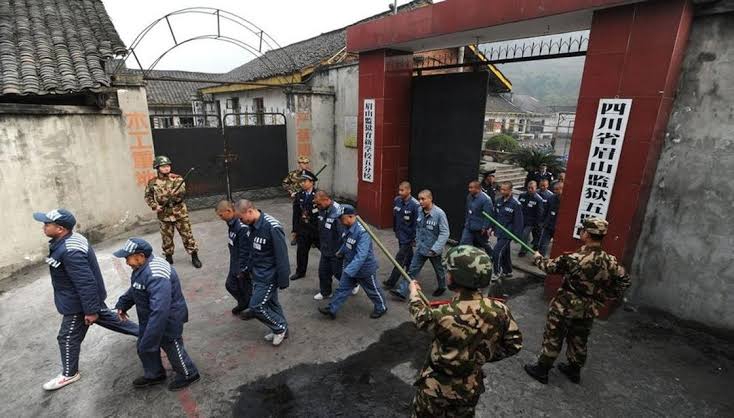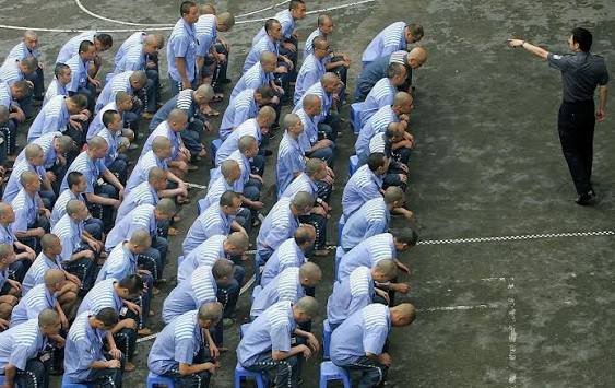 В синей форме они, потому что это пациенты рехаба. Это нарколыги. "Красивая древняя культура" включает в себя гашиш, траву и насвай, если что; ну вот Китай с этим аспектом борется. То, что они не заключённые, доказывается элементарнейше - если увеличить фотографию, у ряда людей есть бороды. В китайской тюрьме всех бреют и бороды отпускать нельзя. Также в статье есть фотография, на которой чётко видно плакат про "Держитесь подальше от наркотиков".