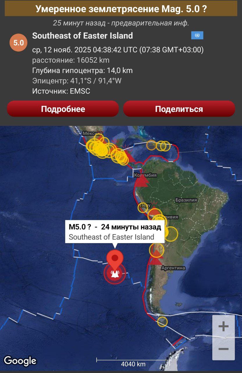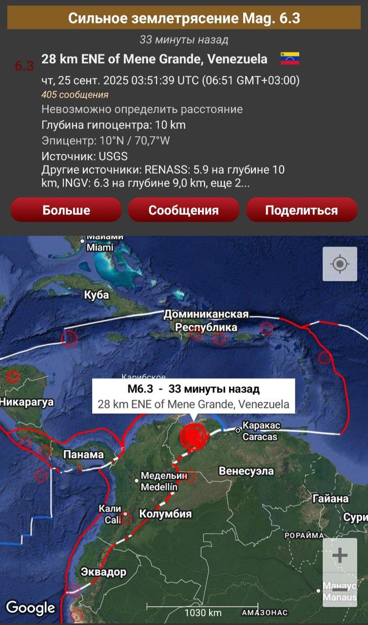 Землетрясение магнитудой 6.3 произошло в Венесуэле в 6:51 по московскому времени. Очаг залегал на глубине 14 км. Эпицентр располагался в 27 км от города Мене Гранде.
