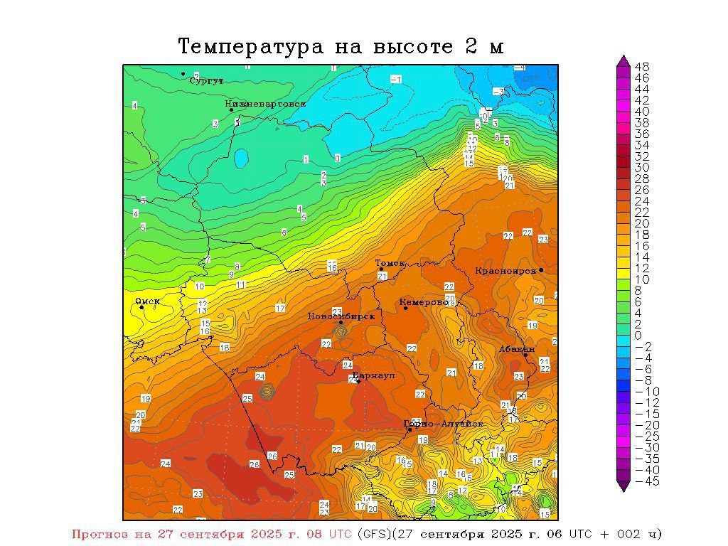 В теплом секторе циклона среднесуточная температура превышала норму на 10-14 градусов! В Новосибирске воздух прогрелся до +25°C, в Новокузнецке +25.7°C, Иркутске +25.2°C, Кемерово +26°C, Барнауле +25.3°C, Томске +25°C, Красноярске +26.6°C.