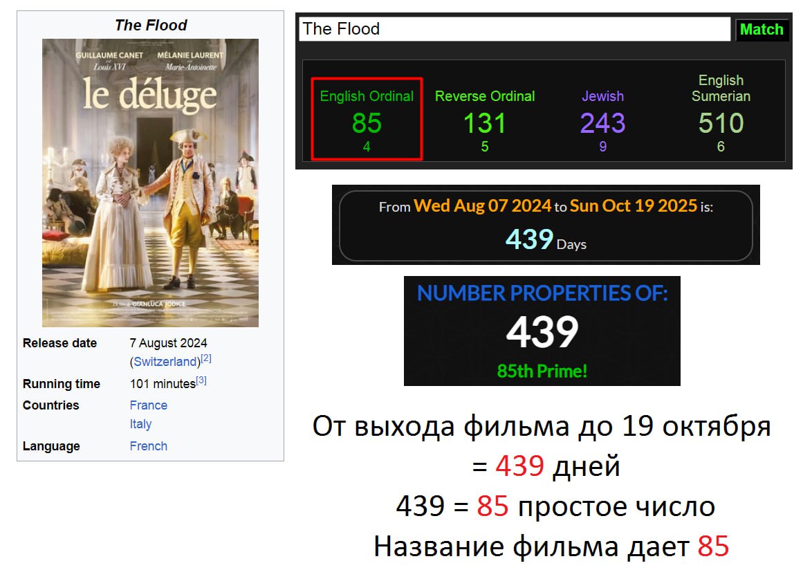 От выхода фильма до 19 октября = 439 дней. 439 = 85 простое число. Название фильма = 85.