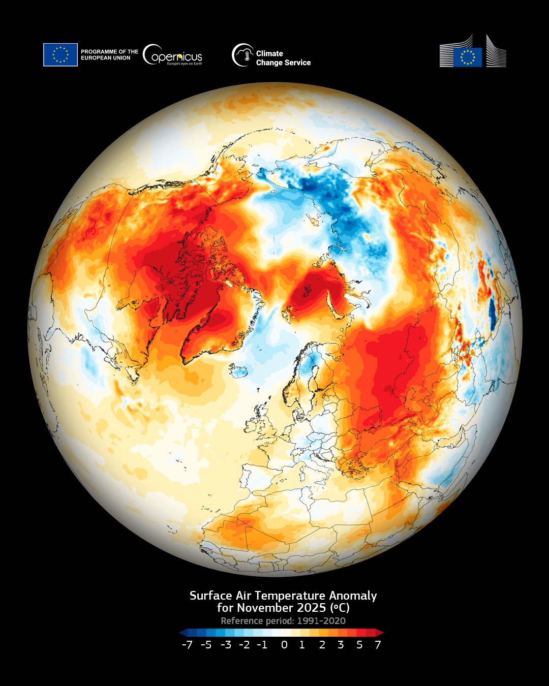 Эта визуализация данных, созданная с использованием данных C3S, показывает аномалии температуры приземного воздуха в Северном полушарии за ноябрь 2025 года.
