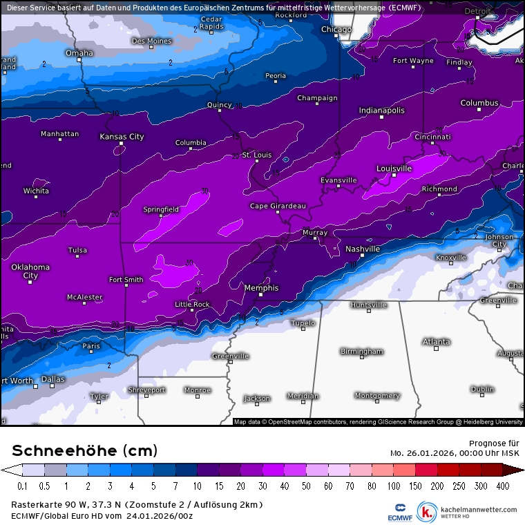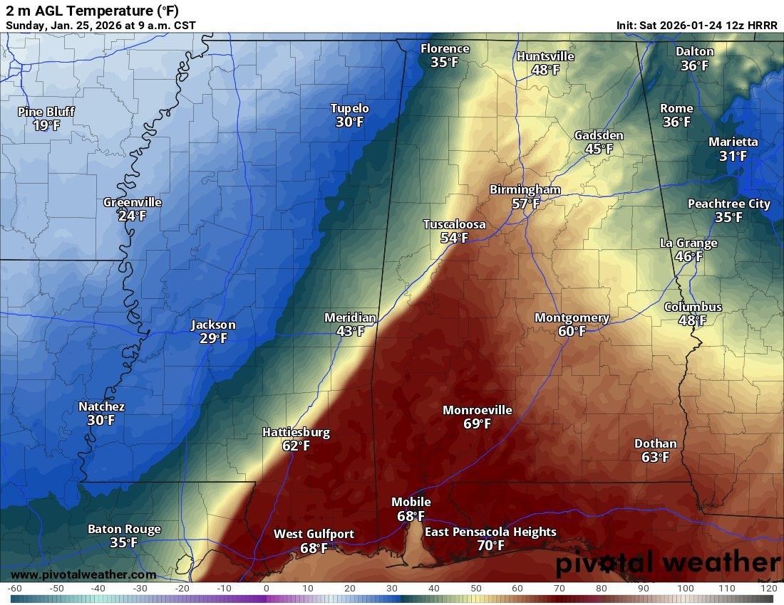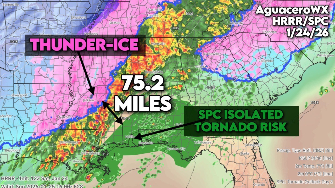 Как и прогнозировалось, в течение ночи, утра и дня 25 января на штаты Глубокого Юга обрушились очень сильные переохлажденные дожди. Десятки миллионов человек оказались отрезанными от благ цивилизации, происходят массовые обрывы электросетей, дороги завалены рухнувшими деревьями, которые не выдерживают давления тонн гололёда на своих ветках и кронах.