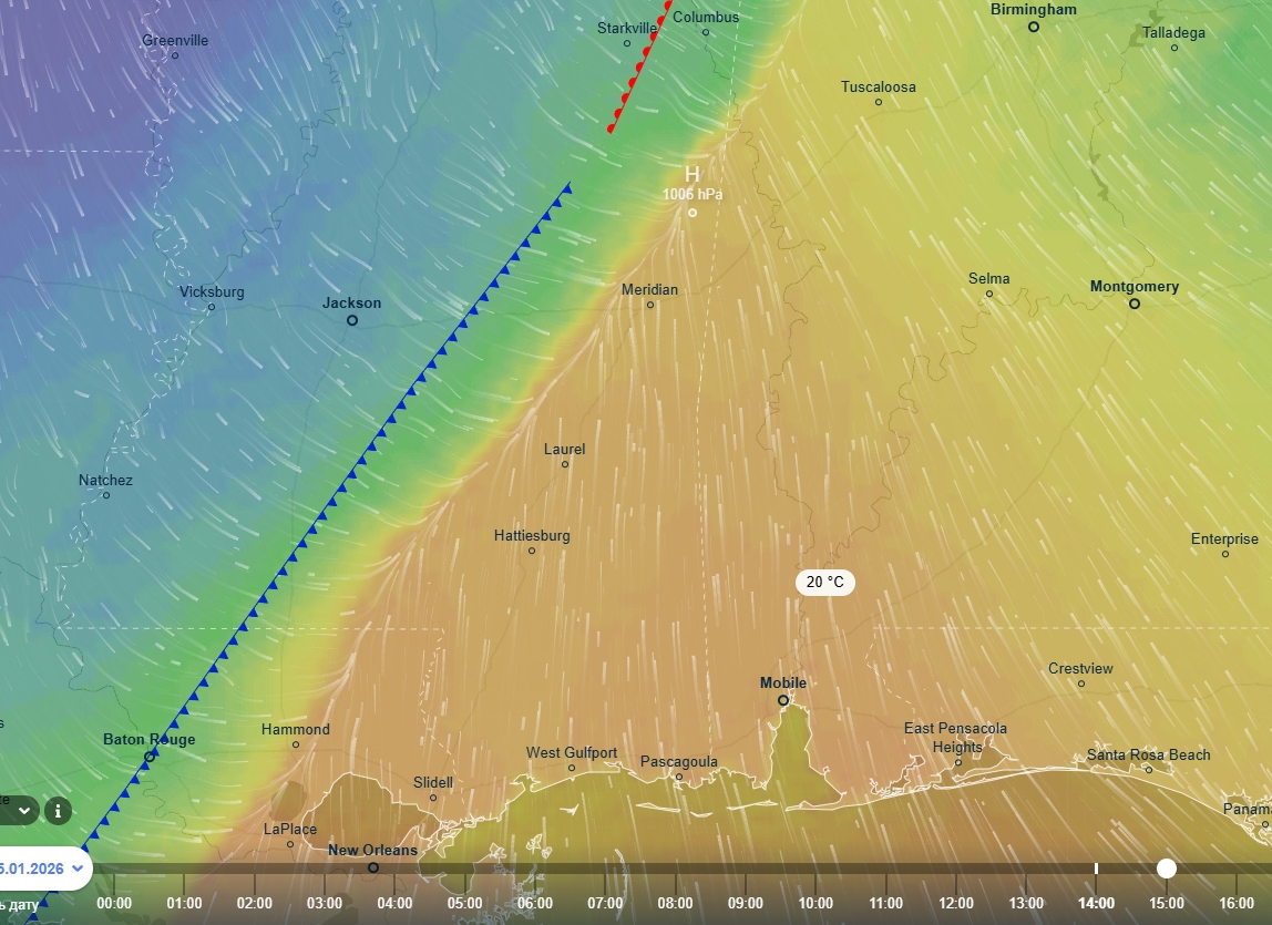 В ближайшие часы циклон начнет продвигаться в восточном, северо-восточном направлении. В его теплом секторе будут условия для очень сильных гроз, разрушительных шквалов и даже угроза формирования торнадо: под удар конвективной стихии попадут штаты Миссисипи, Джорджия и Флорида.