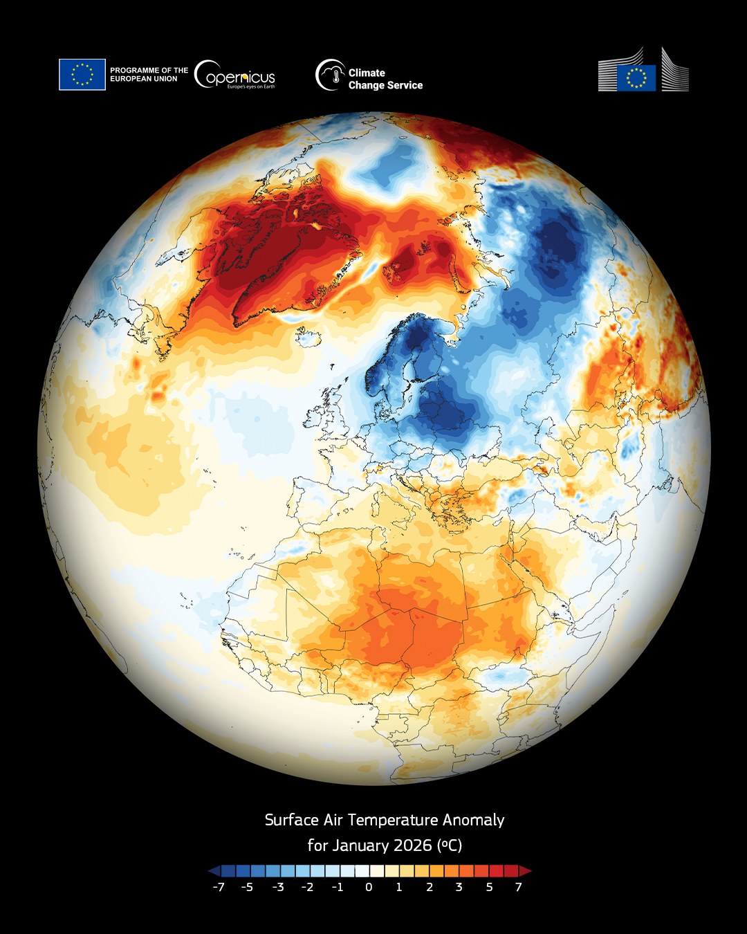 🛰️ Эта визуализация данных, созданная с использованием данных C3S, показывает аномалии температуры приземного воздуха в Северном полушарии за январь 2026 года.