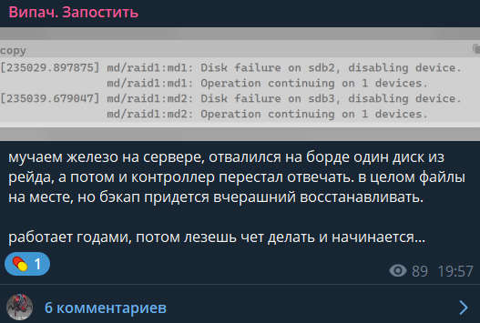 >>952411 Мысль о железе ни разу не утопическая, нынешнюю материнку и память в домашний сервер я купил в 2014 году, к тому момент у них чуть меньше года пробега было. Блок питания из тех же годов. Процы чуть посвежее, тогда цена на них кусалась, поэтому сначала сидел на Xeon 2603 вроде, потом перешли биос и воткнул более свежие 2658v2 лет семь тому. Сетевуха Intel X540 и контроллер RAID лось 9260 тоже минимум лет десять пашут. Просто не надо СХД собирать на консьюмер-грейд железе. Серверные материнки Supermicro с родной ECC Samsung, блоки питания Delta, и контроллеры LSI легко отпашут 20-25 лет в контролируемых условиях. Максимум кондеры могут заболеть в БП, нужно выбрать сразу с приличными типа Nippon Chemicon, да и раз в 15 лет пересадить десять электролитов не проблема. Если все это до кучи повесить на хороший бесперебой (минимум - Ippon Smart Winner/Innova RT, в идеале - APC SURT или Emerson-Liebert GXT), держать низкие температуры, то такое железо работает 25-30 лет, а может и дольше, никто не проверял. Ретроклокеры вон до сих пор с живыми нортвудами и туалетами aka Tualatin играются. Равно как и ресурс DC-grade SSD, сейчас в хоумсервере под горячие бэкапы и активные торренты стоит несколько Seagate Nytro Warpdrive на 400 ГБ - на все из них за четыре года записано уже больше петабайта и ddcli бодро рапортует, что здоровье диска 85%, т.е. при менее интенсивной записи я сдохну раньше этих SSD. Насчёт флешек - ее можно случайно убить статикой или на ровном месте рыгнет контроллер, важные данные туда писать - ну такое. Для LTO и DVD/BD можно просто держать резервный привод/стример, если они резко начнут пропадать из продажи.