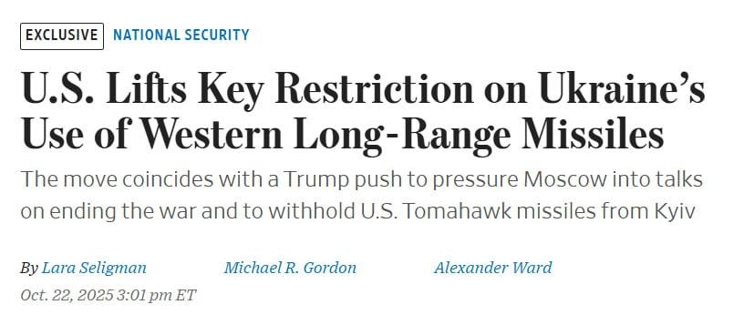 22:07 — ❗️США сняли ключевое ограничение на использование Украиной поставленных союзниками дальнобойных ракет, что позволит Киеву наносить удары вглубь России, сообщает WSJ