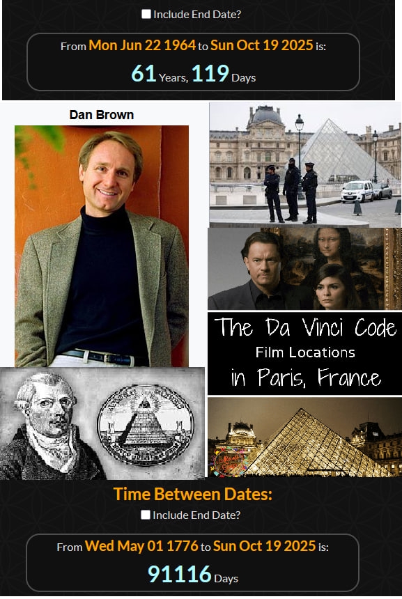 Автор книг "Ангелы и Демоны", "Код да Винчи" Дэн Браун - со дня его рождения до ограбления Лувра - 61 год и 119 дней, что является амбиграммой "61119" (читается одинаково при переворачивании). Со дня основания общества баварских иллюминатов до ограбления Лувра прошло 91116 дней, а это амбиграмма "91116". Тема найденной короны при ограблении и короной Трампа от Вэнса не случайна: стоит отметить определенную схожесть имени вице президента JD Vance и имени художника Leonardo da Vinci, что в свою очередь может намекать на место завязки сюжета книги "Код да Винчи" - Лувр. Издательский дом (книг Дэна Брауна) Penguin Random House LLC расположен по адресу 1745 Broadway, New York, NY 10019.