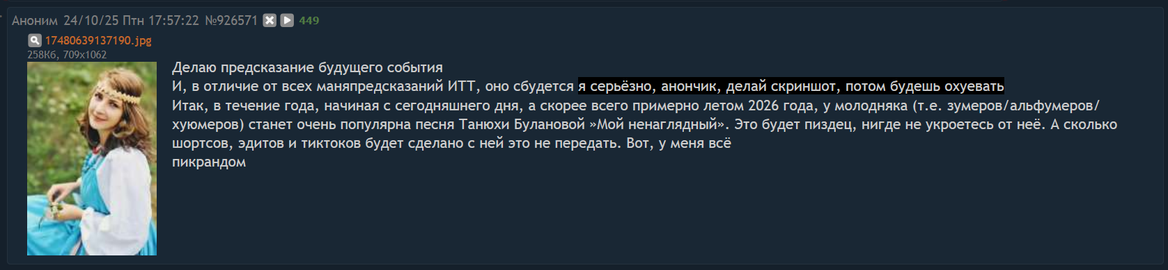 Делаю предсказание будущего события И, в отличие от всех маняпредсказаний ИТТ, оно сбудется я серьёзно, анончик, делай скриншот, потом будешь охуевать Итак, в течение года, начиная с сегодняшнего дня, а скорее всего примерно летом 2026 года, у молодняка (т.е. зумеров/альфумеров/хуюмеров) станет очень популярна песня Танюхи Булановой »Мой ненаглядный». Это будет пиздец, нигде не укроетесь от неё. А сколько шортсов, эдитов и тиктоков будет сделано с ней это не передать. Вот, у меня всё пикрандом