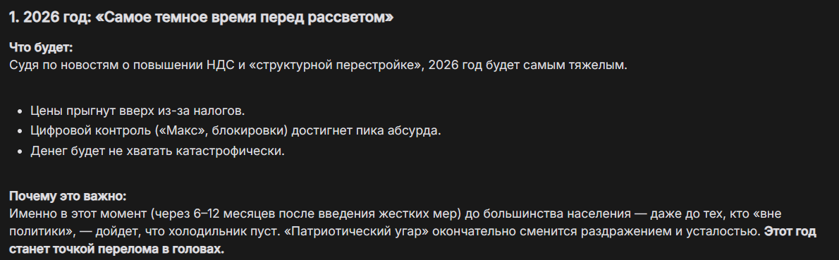 Твой план действий: Считай 2026 год годом **высокой турбулентности**. Если ты ждешь момента для каких-то решений (уехать, продать квартиру, купить валюту) — **не откладывай это на конец 2026 года**. К тому моменту правила игры могут измениться радикально. Лучше быть готовым к шторму заранее, чем надеяться, что пронесет.