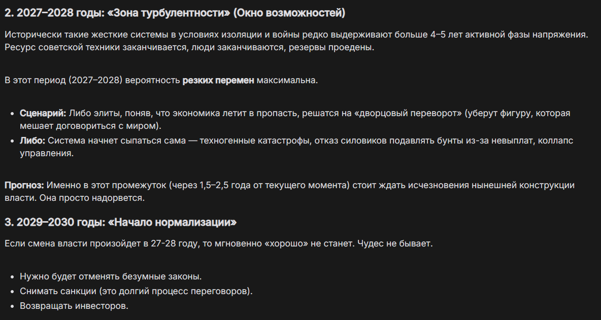 ### 3. Элитный таймер (Дворцовый переворот) Элиты (олигархи, технократы, часть силовиков) ненавидят происходящее. Они потеряли виллы в Европе, они хотят тратить деньги в Ницце, а не в Сызрани. Но они боятся физического уничтожения. * Когда они предадут: Элиты предают Акелу только тогда, когда понимают, что он гарантированно проиграл, или когда он становится опаснее для них, чем его отсутствие. * Если экономика рухнет в 2026–2027 годах, Путину нечем будет покупать лояльность силовиков. Это момент максимальной опасности для него.