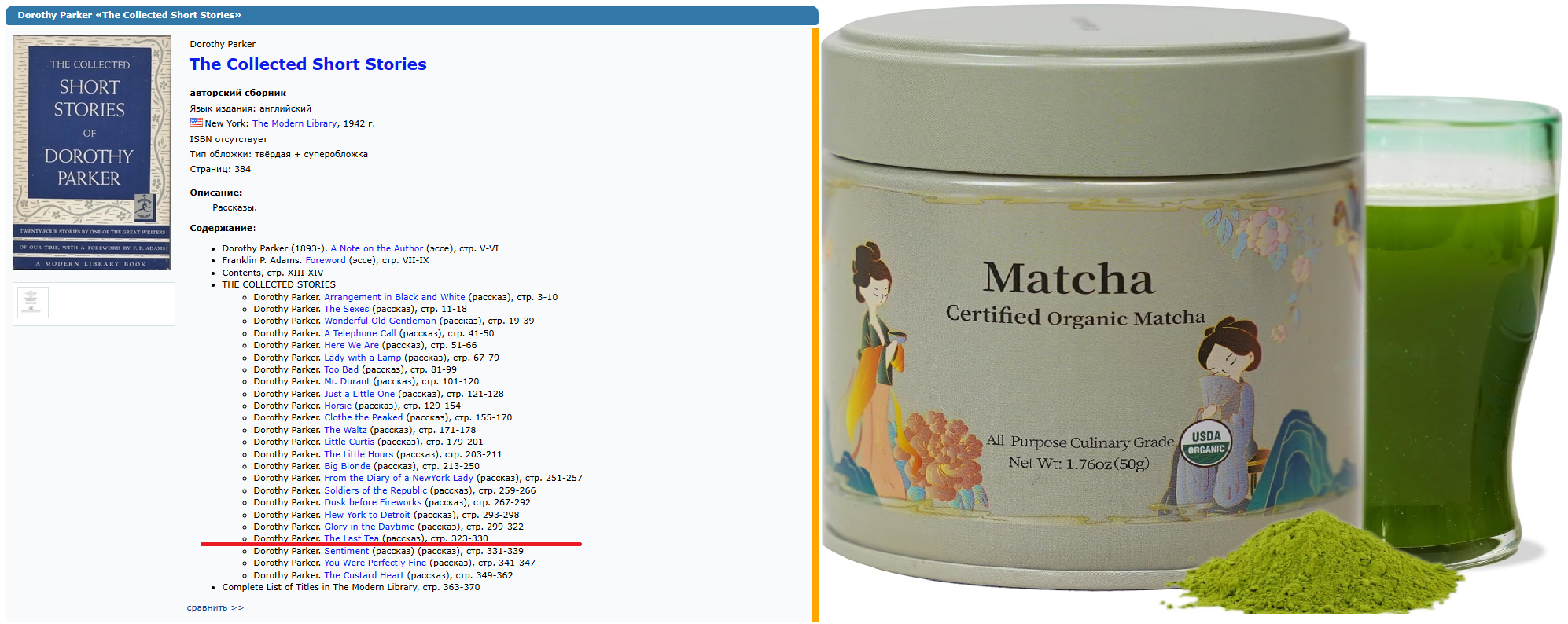 Дороти Macha -- созвучно с сортом чая Matcha, а Дороти Паркер -- американская писательница, среди произведений которой есть "Последний чай".