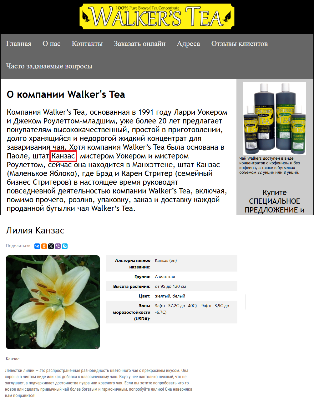 Лили Уокер -- Walker's tea -- компания, производящая чайный концентрат, находящаяся в Канзасе, который также является названием сорта лилий (лилия Канзас), а они, в свою очередь, являются популярной добавкой к чаю и часто изображаются на упаковках.