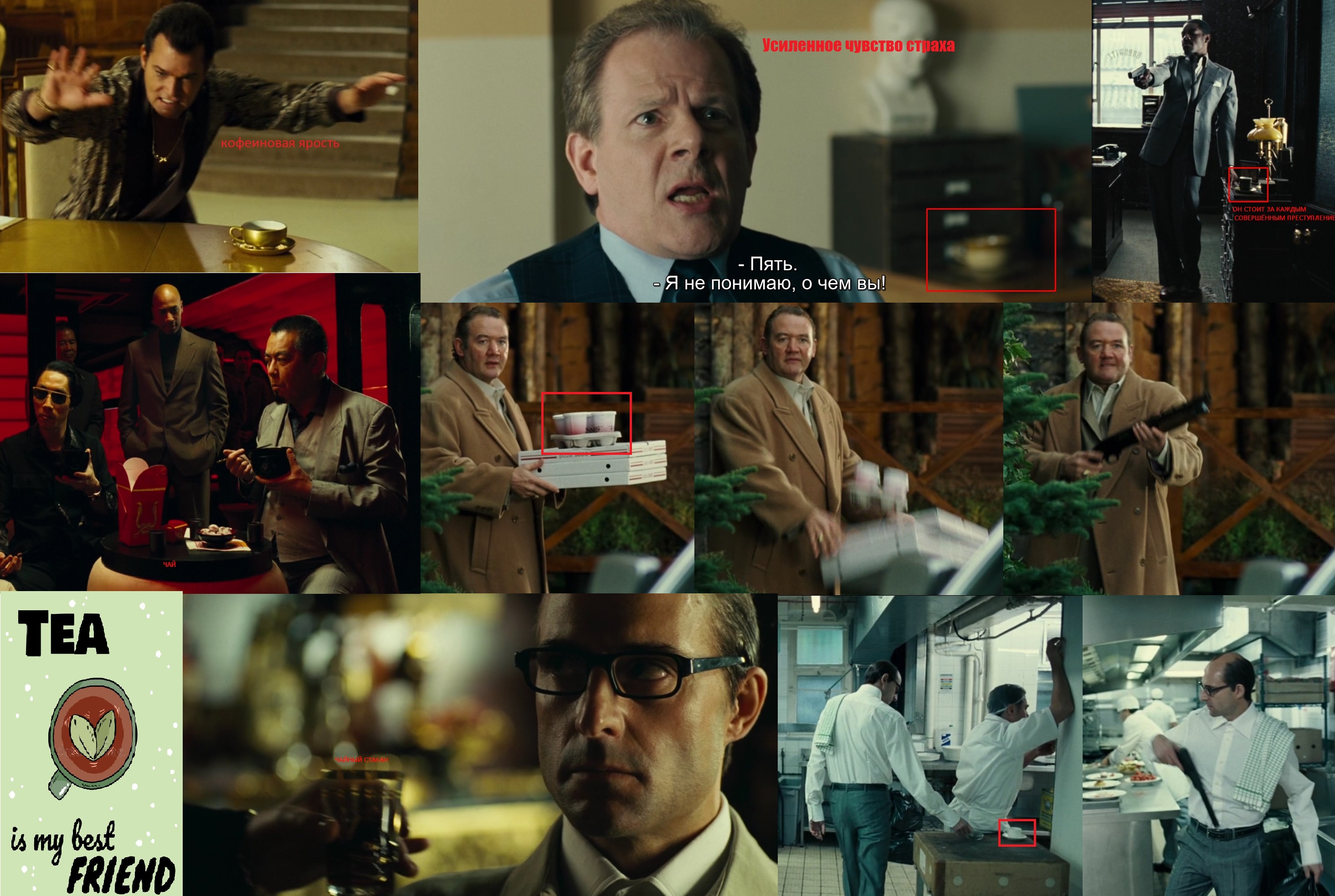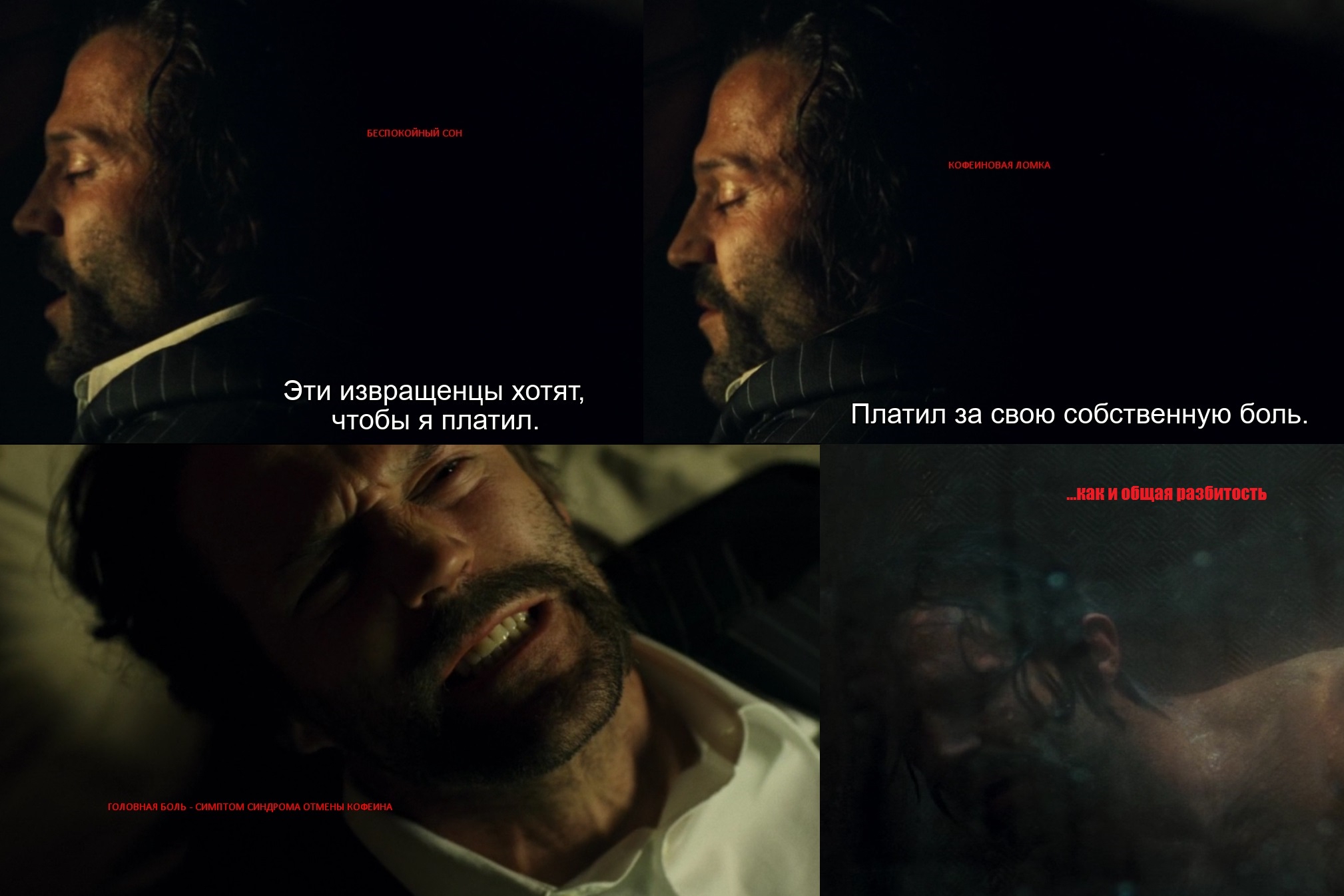 Фразы "платим за собственную боль" и "пойми причины своей боли", идя параллельно с рассказом о способе духовного освобождения от фермера (Сэма Голда) внутри себя, отсылают ещё и к главному симптому кофеиновой ломки -- головной боли, которая возникает, если кофеин не принимать хотя бы сутки-двое, что происходит очень часто, так как кофеиновые наркоманы, коими является большинство людей, не осознают своей зависимости, нередко пропуская приём дозы по тем или иным причинам, а затем мучаясь от головной боли. И заговор на этом моменте становится очевидным, если обратить внимание на состав таблеток от головной боли, в которых везде содержится кофеин, который нужен там лишь для того, чтобы снимать ломку и не нарушать наркоманскую "систему". При этом не описан никакой механизм улучшения биодоступности основных обезболивающих компонентов за счёт кофеина. Есть лишь исследования, где средства с кофеином помогали людям с головными болями лучше, чем средства без кофеина -- объяснимо, учитывая, что наиболее частой и банальной причиной головной боли является кофеиновая ломка. Так что кофеин просто обозначается, как "анальгетический адъювант" с доказанной эффективностью. При этом никакого исследования причинно-следственных связей не было -- видимо, кофеиновые жрецы и так понимают, что, зачем и почему. А убедиться в этом может любой человек, чья печень не расщепляет кофеин в считанные минуты (изредка такое бывает) -- достаточно "отменить" кофеин и дождаться головной боли, которая наступит через 1-2 суток. Далее вас ждёт показанное на примере Джейка Грина в "Любителе чая" состояние -- упадок сил, меланхолия, плохой сон. Затем вы заметите, как вы станете спокойнее (обратите внимание, как во второй половине фильма после повторного обследования и далее Джейк становится спокойнее в большинстве ситуаций) и выносливее (сцена побега от здоровяка с дробовиком) -- под кофеином, как уже было написано выше, на стресс-факторы остро реагируют не только психические, но и моторные функции, с гиперфункцией сердца и лёгких, заставляя нас уставать раньше, чем дОлжно. Потливость и тревожность, показанные вначале в сцене в лифте уходят, и окончательно это показано в финальной сцене в лифте -- пример а-ля "до и после".