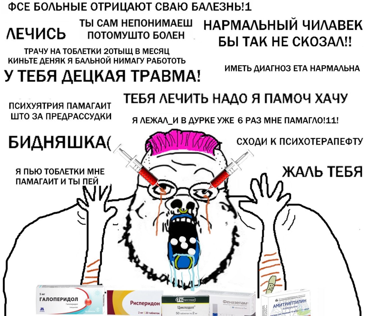 > гойских баранчиков Ты сам быдло ебанное, не можешь проникнуться чужими проблемами. Попробуй не давать шизу нейролептики - он заовощится и подохнет от психоза даже быстрее, чем если бы его пикчали древним галоперидолом (а сейчас уже есть норм препараты)
