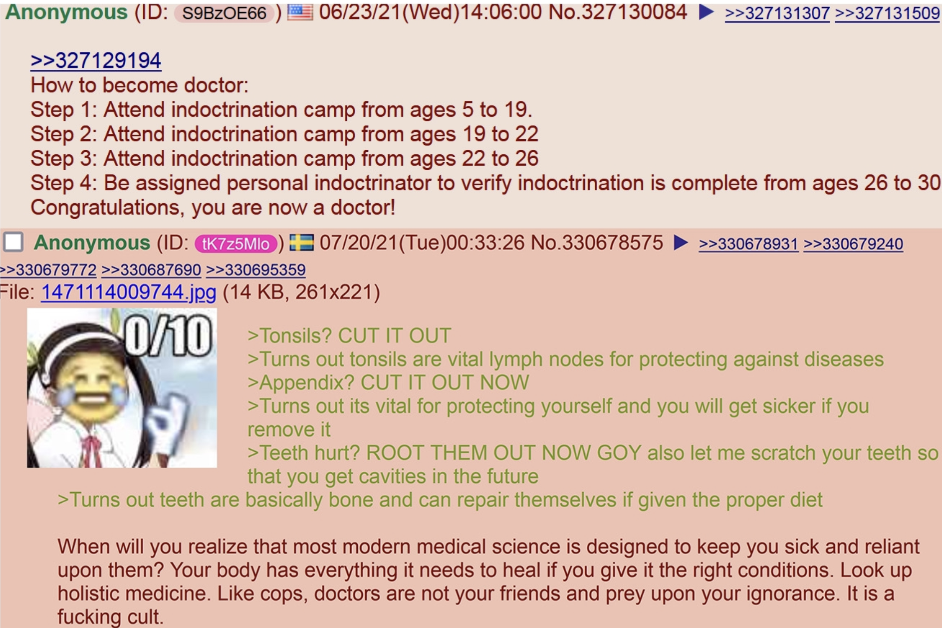 >>955616 >Я как раз во время скамдемии скомпилировал первый пикрил. Вот это литералли ми. Ну чудом увернулся от удаления зубов только, т.к раньше хотел брекеты ставить. Меня пиздец удручает то как меня безжалостно порезали в юности - миндалины, потом аппендикс. Сдохну/начну стареть теперь наверное лет на 15 раньше. С аппендицитом кстати попал в больницу в конце февраля 2020, вот это и был финальный гвоздь моей веры в медицину. Алсо помню я уже был в курсе тогда еще непонятного ковидла, один челик-тревожник на этаже бегал и тревожно разговаривал со всеми про новый страшный вирус. А медсестры и врачи при вопросах о короне отмахивались, говорили хуйня этот вирус. В итоге первыми же были проткнуты, и неоднократно, я уверен.