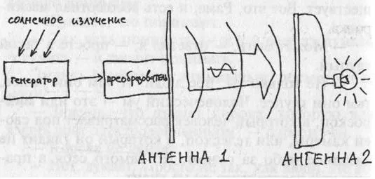 Взад-вперед, по синусоиде. Стержень называется антенной. От этого образуются радиоволны, которые летят со скоростью света. Чтобы поймать энергию этих волн, нужна другая антенна. У антенн должен быть размер, пропорциональный длине волны, потому что энергия передается по принципу резонанса. Знаешь, когда ударяют по одному камертону, а рядом начинает звучать другой. Чтобы второй камертон зазвенел в ответ, он должен быть таким же, как первый. На практике, конечно, все сложнее — чтобы передавать и принимать энергию, надо особым образом сфокусировать ее в пучок, правильно расположить антенны в пространстве, и так далее. Но принцип тот же… [пик1] Теперь давай нарисуем другую картинку… [пик2]