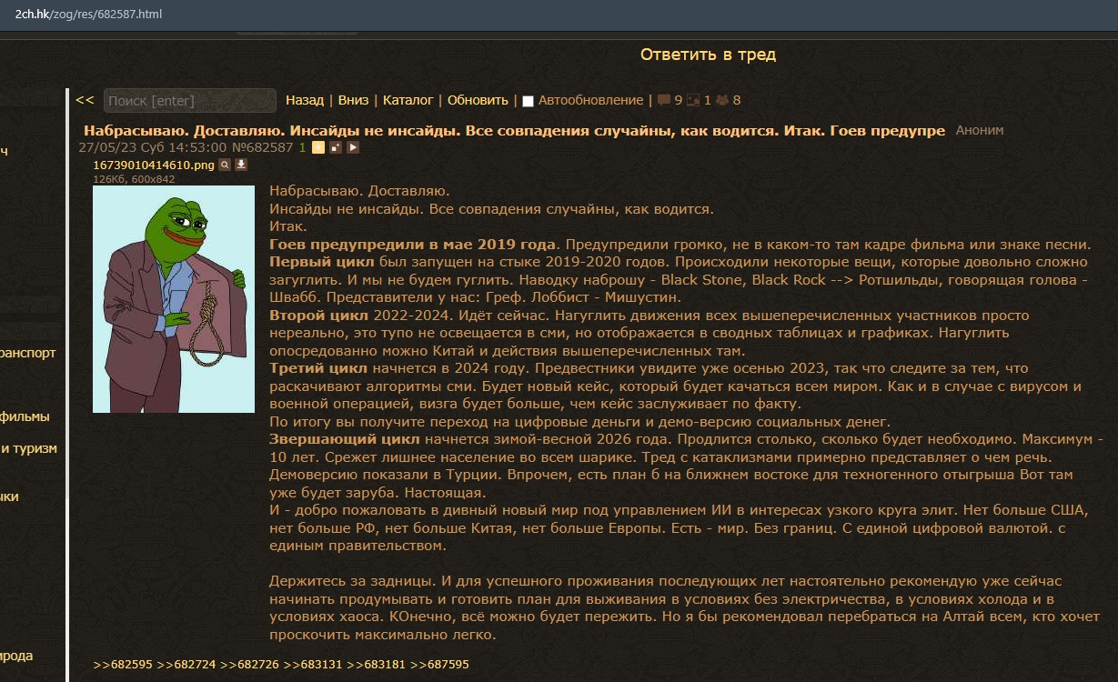 Аноны всё ждут конца света, цеховики им тут с три короба разгоняют, лишь бы аноноы отвлечь от надвигающегося кризиса, после которого аноны будут жить все хуже и хуже, пока не вымрут.