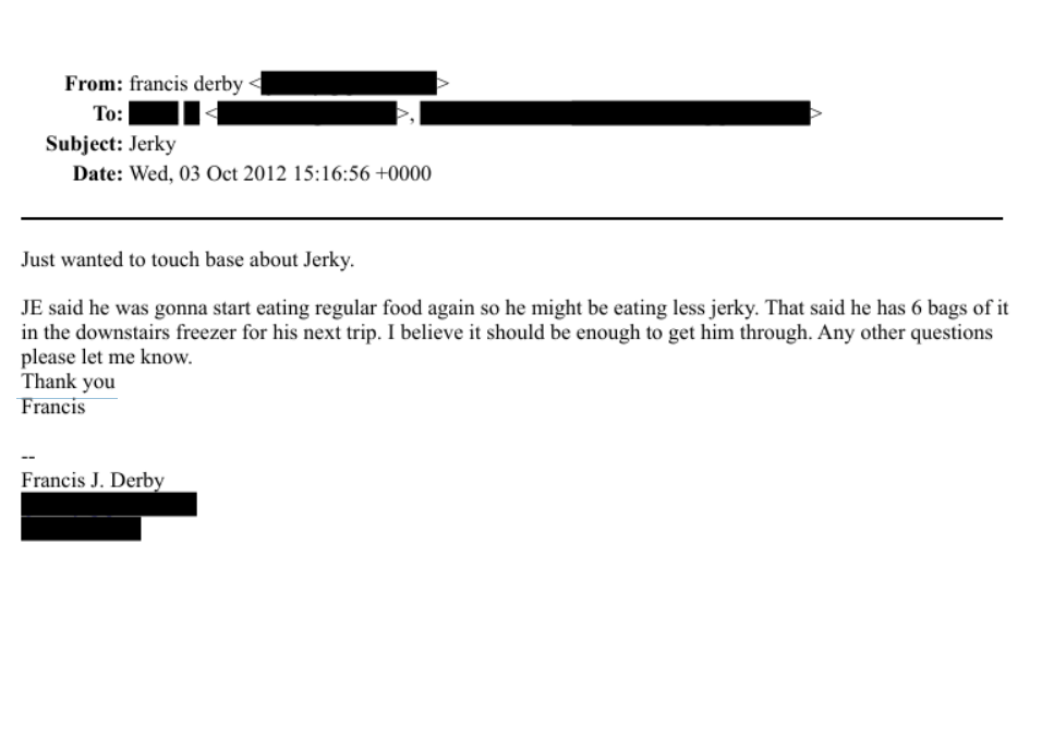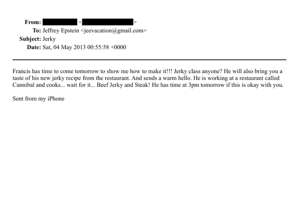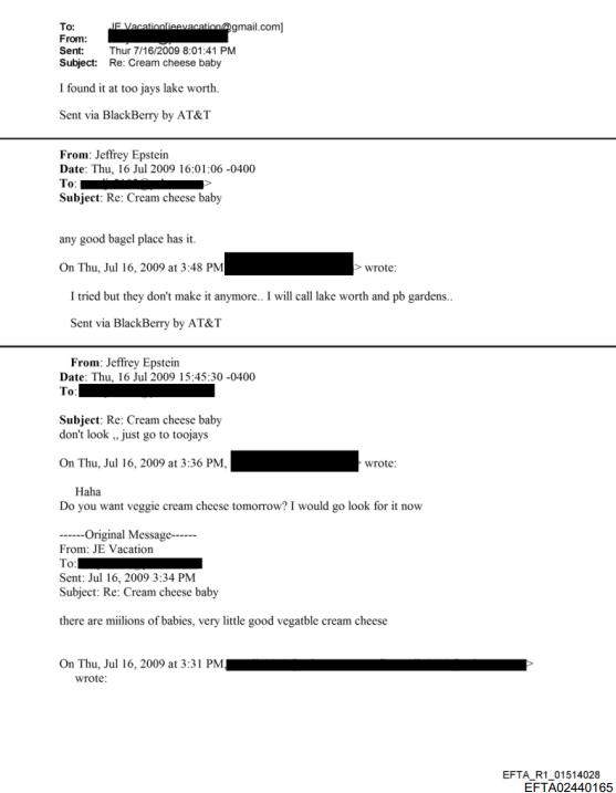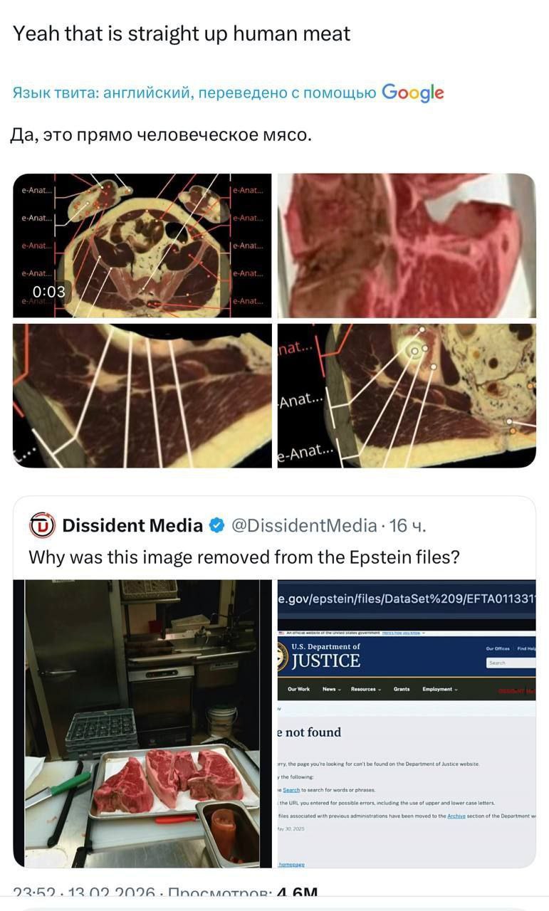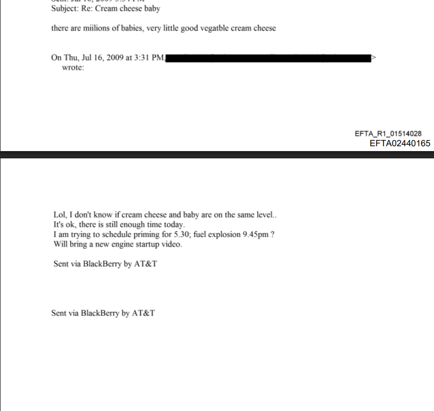 В слитых документах Эпштейн открыто заявляет, что любит есть мясо младенцев. Особенно ему и его гостям нравится мясо русских детей, их он сравнивает с креветками и белыми акулами. К диалогам приложена фотография под названием "отличный ужин"