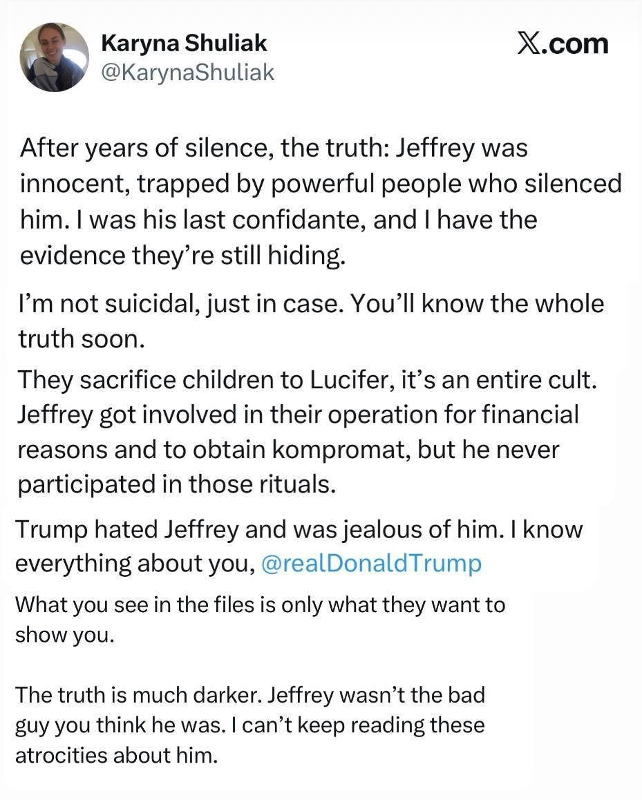 Все видео типа того с якобы пытками ребенка (на турецком языке, ага), видео с поехавшей моделью из Мексики (просто шизичка, никакого отношения к Эпштейну) и куча ии видосов будто специально сливается чтобы хоть немного заинтересованный глубже чем "респы/демы плохие" натыкался на вот такую кучу фейков как это с пицца гейтом было когда шизам скормили хуйню и до сих пор ей тыкают.