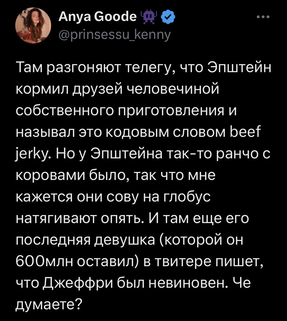 Файлы Эпштейна — буквально высосанная из жопы хуета. Миллионеры, политики, активисты, чуть ли не сам папа римский шли на исповедь к нонейм шлюховоду, сознавались в каннибализме и кровавых оргиях, а тот собирал терабайты компромата на них. И сейчас это всё сливается в открытый доступ, и Трамп с Гейтсом ничего поделать не могут. Боже, благослови Америку и её суды, которые сильнее любой политики и еврейских диаспор! Верим! Я поверил! (с)