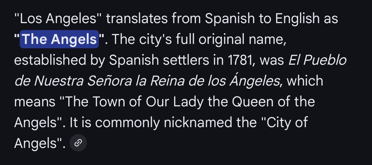 >>958123 подлижу опу. даже если просто "ангелы" то ангелы тоже разные бывают. люцифер тоже ангел. только падший. а для англоязычного слуха los angeles это что то типа lost angels, работает на подсознании кароче.