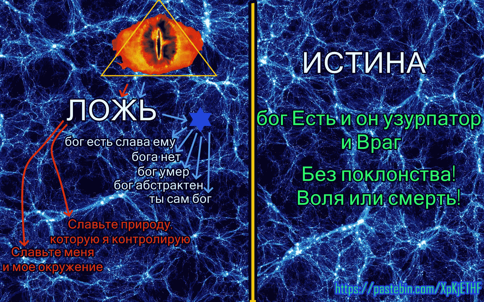 Действия Сатаны в Библии (сборнике неверно переведённых еврейских сказок), в том виде, как их интерпретируют жидовствующие, были не злобными, а революционными. Дьявол на самом деле выступал за равенство, распространение знаний и расширение возможностей человечества, бросая вызов автократическому правлению несправедливого бога.