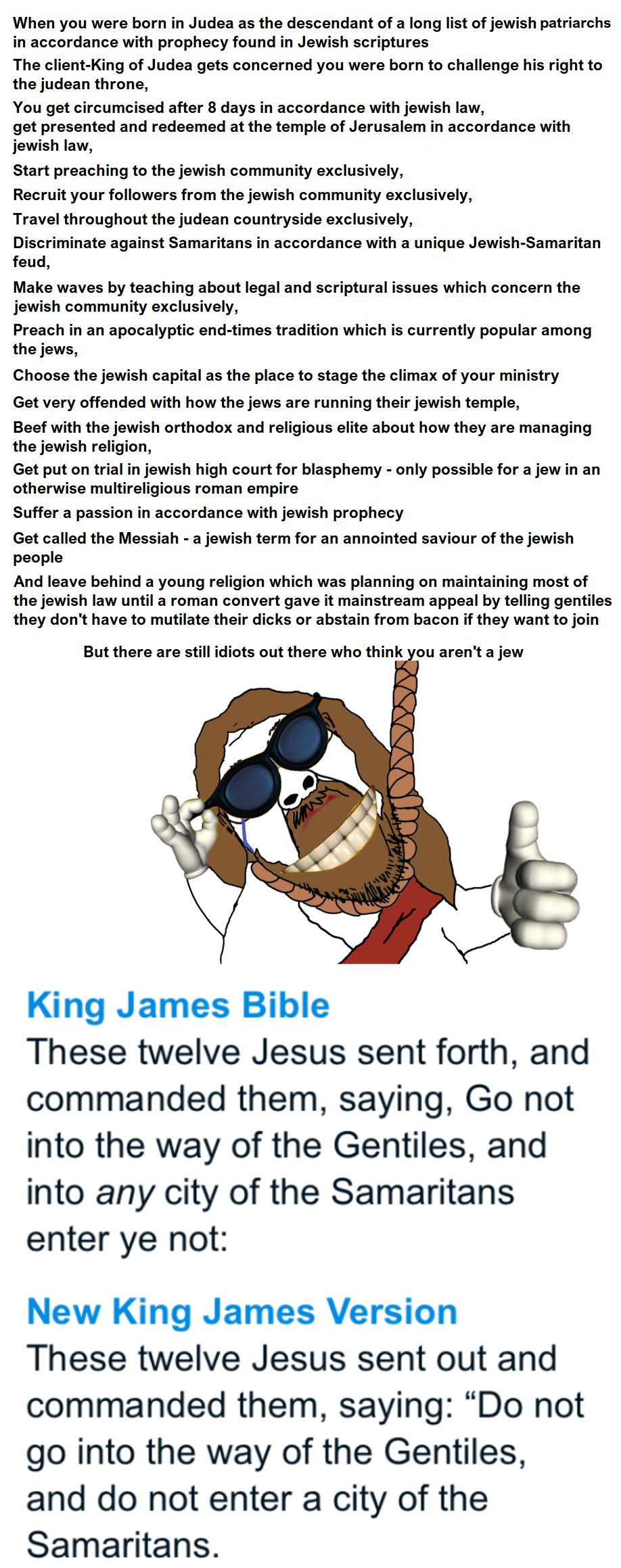 >>962903 > Там просто говорящий змей подговорил Еву захавать запретный плод, за что бог и лишил змей НОГ. Этот запретный плод содержал знания, Яхве не хотел, чтобы гои были умны > А иисус сам боролся с неравенством, и буквально разьебал священников которые объебывали бедняков и забирали процент. Инфоцыгане тоже порой делают благие дела, чтобы обелить себя. Алсо > сосать жиду