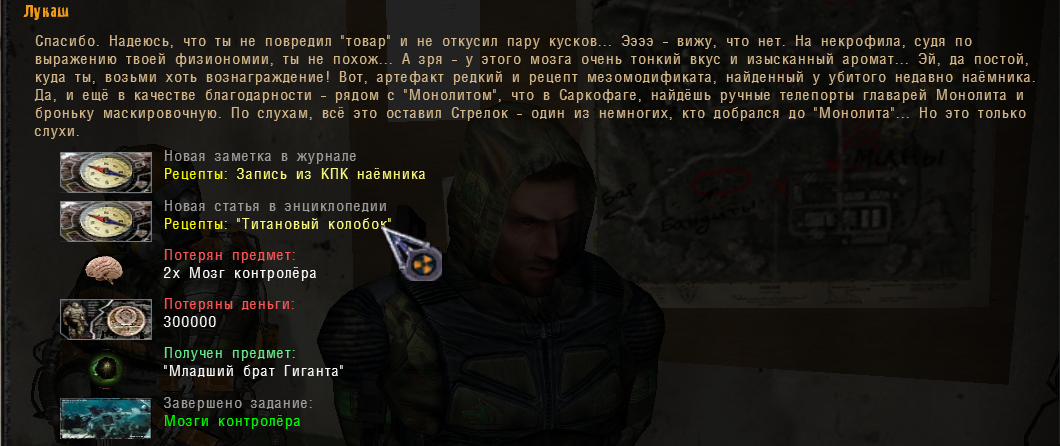 Циклички на предметы можно чуть-чуть поэксплуатировать - дать ему несколько пачек 10мм патронов, потом АЕК-971 (который в конце концов получится достать, и который ни по каким цепочкам в целом состоянии не нужен), а потом закрыть гештальт одноразовой партией в 10 штук HK MP5K-PDW (обильно валятся с бандитов, стоят копейки) - за это Адреналин даст "Мох" (высшая форма артефакта на выносливость).