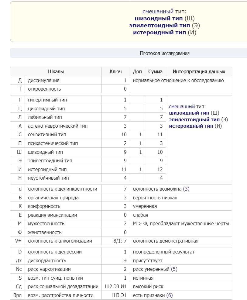 >>3156084 И так поехали, возможны с твоей стороны некоторые правонарушение, ты не сильно стремишься быть независимым, шкала алкоголя тоже спорная, но мы ее опишем - пьешь за компанию, демонстративно. В тебе проявляются 3 типа личности и судя по всему Элиптоидная конфликтует с Истероидной, возможно можешь попробовать психоактивные вещества, замечу не подсесть, а попробовать. Если и прибегнешь к суициду, то он будет настоящий, не демонстративный. Есть признаки псих. расстройств, ну и как и у большинства здесь есть риск не влиться в социум. >>3156127 Полностью солидарен.