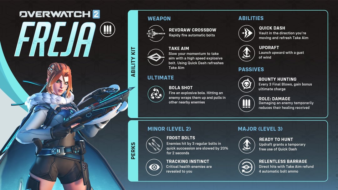 Вчера пощупал нового героя Фрею Вообще мне прям пиздец вкатила, может даже буду мейнить. Этакий прыгучий снайпер. Гейплей динамичный - взлетаешь, один прицельный выстрел с зависанием в воздухе, рывок в бок который перезаряжает прицельный выстрел, еще выстрел и снова рывок и еще выстрел. И того три выстрела за эту комбинацию. В другое время обычная стрельба с вклиниванием прицельных выстрелов и рывков уже на земле. Вообще выглядит это очень кинематографично. Но вот при взлете и прицеливании персонаж буквально зависает в воздухе. По идее всякие хитсканы будут в этот момент ебать. Но если все делать быстро и грамотно и висеть по пол часа на одном месте, а реализовывать рывок, то прям проблем быть не должно. Все, у кого меньше 300 здоровья умирают с двух попаданий, так что норм. Никакого ваншотного лаки шота в голову, нужно прям красиво два раза попасть. Сложно если честно, ведь нужно дешиться, а то вдова или эш или солд разнесут. Сложно но интересно. Ульта говно кста, но видимо это попытка сделать как раз слабую быструю ульту, которая будет раза в полтора или два чаще играться, чем какой нибудь гравитон или аннигиляция. Но это все сырая версия, ее еще будут наверняка реворкать. Лично я бы еще сильнее ослабил ульту и сделал ее более быстрой. Ульта и так не ваншотает, так что можно урон еще подрезать, но сделать чаще и более связывающей. И еще я бы сплеш урон от прицельных выстрелов увеличил. Или радиус. А то в этой комбе с дешами максимум три выстрела и что бы убить, нужно двымя попасть и все это в постоянных рывках. Хорошая была бы компенсация в виде хоть какого нибудь урона от одного промаха. Вроде звучит как ахуел, урон за промах? Но он и так есть, просто радиус и цифры урона не особо рассчитаны и наносится буквально 10 урона где то. В среднем. Типа или вообще его убирайте или сделайте нормальным, что бы хоть как то чувствовалось. Да и в ульту можно потому и ослабить, типа двух поймал, в каждого по стреле и урон уже хороший
