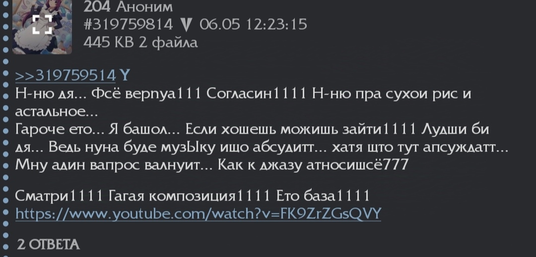 >Чево ти тям хатель увидеть... Я жи говорил про треид с длинопостями... Я всо жи решилсо некотории пости почитатю и тяма в адном из них било упоминание цикадотреида из /a/... И я ведь ни ряз слишол про етот треид уже111 Ню воть решил било ознакомиццо, но треидов нема... Я как только не искал111 Фсе ключевии слова вводил... Нашол лишш тред где цикадопостири устроили гагои-то конфликт па поводу цикадотреидов етих... Но я мала чьто поняв без контекстя... Но очинь интереснya111 Как-то тяк...