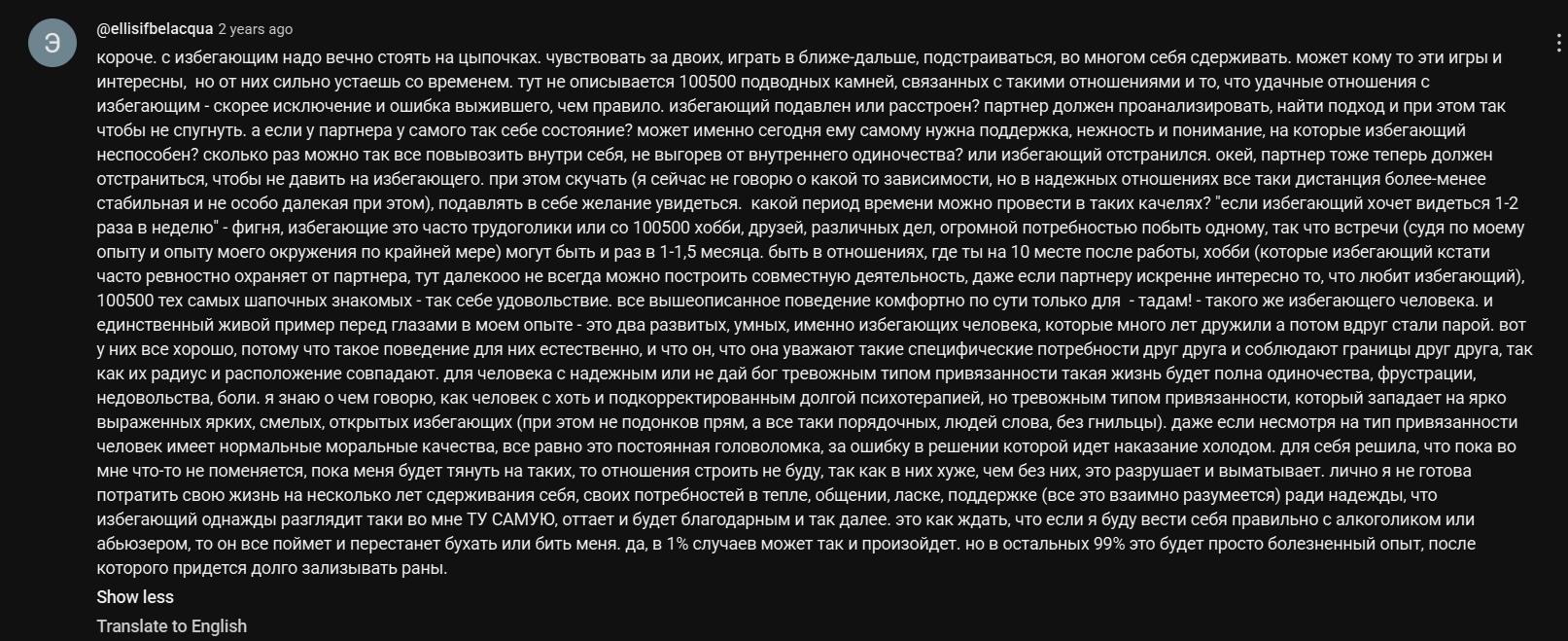 >>3722374 Посмотрел на ютубе видео с нарезанными ответами с Реддита из треда с названием на подобии: "Какие ошибки делают новички в отношениях?". Больше всего проникся ответом как раз-таки про осторожность и шахматы. Мол, если такое присутствует у тебя, то знай, что это не закончится. Ещё был пост про надёжность - мол, даже когда партнёра нет с тобой, ты не беспокоишься за него. Если такого нет, то ГГ. Ну и ещё пара-тройка постов, которые подпадали под мою ситуацию. Там видео было больше не о том, что "не стоит так делать", а о звоночках, на которые стоит обратить внимание и задуматься о таких отношениях. У меня этих звоночков набралось прилично.