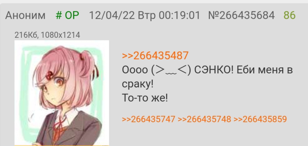 >>3718767 >Рекомендуешь к прочтению? Угу, в принципе она хорошая. И тоже в основном повседневность. С вампирами. Тебе понравится. >Лесть ради пропитания... Вампиры ловкие и сильные, можно убивать и прятать людей, выпивать досуха, или ещё что. Если хочется одну и ту же кровь пить снова и снова, видимо действительно вкусная. >А без таких странных личностей творческие шедевры будут выходить куда реже Вот из странных личностей самый топ-1 базовик - это Цукуши, который автор Made in Abyss. Надеюсь он всё же завершит своё произведение искусства до того как покинет этот мир. Настоящий герой нашего времени. >Точно-точно, прям все попунктно подходит, без личностных дополнительных пожеланий? Во многом. Образ в целом подходит. Даже внешность. И статус. Это не просто монстродевка даже, а нечто практически с самого верха бытия. Пожалуй она - единственная, с кем мне когда-либо хотелось быть вместе. Да, у меня даже аниме вайфу нет и не было. А ещё очень подходит к одной из моих любимых фантазий, хотя там у меня была немного иная роль. Однажды я найду её. Или она меня. >Ты сам кстати, семейный? Ни за что. Не с людьми.