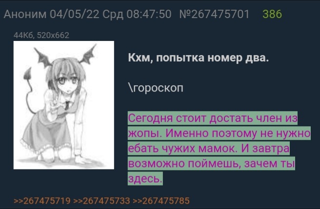 >>3718616 >Какие самые нелюбимые? Наверно, происходящие от животных которых я не люблю. Тараканы там всякие. >Ночи Сов А что это? А ты смотрел Yofukashi no Uta? Там тоже подобный сюжет. Хорошее аниме, и опенинг/эндинг превосходные. Жаль в манге куколдский финал, мангакам надо проводить децимацию пока оставшиеся в живых не вытравят из себя этот фетиш. >прагматичность из-за справедливого неверия в благополучный исход или идти на риск из-за несоизмерно выгодного выигрыша Если ничего не делать, то ничего не изменится же. А так, представь что ты ИРЛ встретил вампирку, которая в тебе заинтересована. Твои действия? >А ты читал мангу? Какую? >Какие монстры могут и хотят ползать, кроме инсектоидов Змейки! :3 Да и вообще всё чешуйчатое. И думаю монстролольки всех сортов. >Подобное потомство часто родителей съедает вдобавок Наоборот, у таких видов чаще родители едят или друг друга, или потомство. Но думаю надеюсь на монстродевочек это не распространяется. У животных жк скрипты в голове.