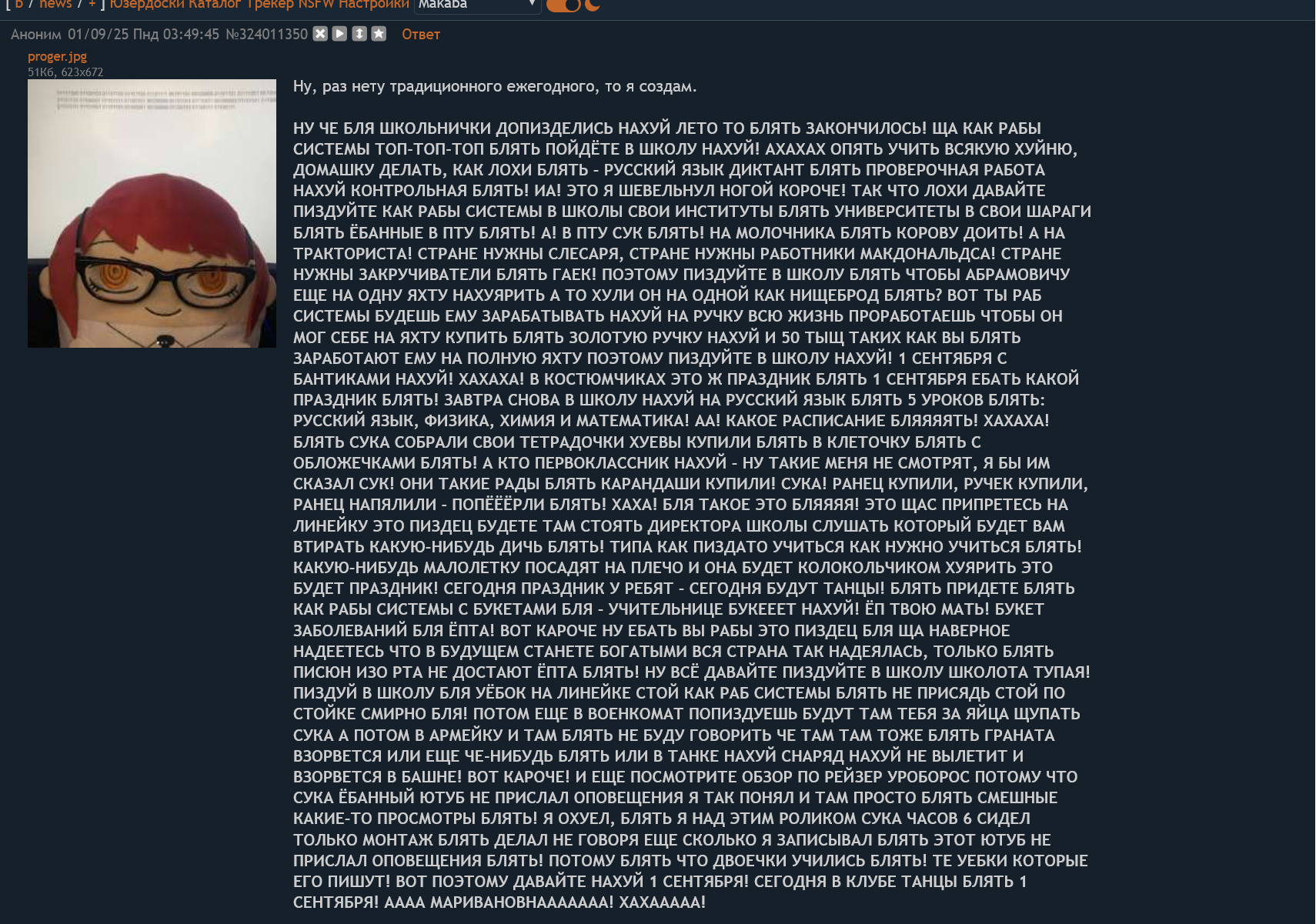 НУ ЧЕ БЛЯ ШКОЛЬНИЧКИ БЛЯ ДОПИЗДЕЛИСЬ НАХУЙ ЛЕТО ТО БЛЯТЬ ЗАКОНЧИЛОСЬ ЧЁ БЛЯ ЩАС КАК РАБЫ СИСТЕМЫ НАХУЙ ТОП ТОП ТОП БЛЯТЬ ПОЙДЕТЕ В ШКОЛУ НАХУЙ ОПЯТЬ УЧИТЬ ВСЯКУЮ ХУЙНЮ БЛЯТЬ ДОМАШКУ ДЕЛАТЬ БЛЯТЬ КАК ЛОХИ БЛЯТЬ РУССКИЙ ЯЗЫК ДИКТАНТ БЛЯТЬ ПРОВЕРОЧНАЯ РАБОТА НАХУЙ КОНТРОЛЬНАЯ БЛЯТЬ ВОООТ ТАК ЧТО ЛОХИ ДАВАЙТЕ ПИЗДУЙТЕ КАК РАБЫ СИСТЕМЫ В ШКОЛЫ СВОИ ИНСТИТУТЫ БЛЯТЬ УНИВЕРСИТЕТЫ СВОИ ШАРАГИ БЛЯТЬ ЁБАНЫЕ СУКА В ПТУ БЛЯТЬ АААА В ПТУ СУКА БЛЯТЬ НА МОЛОЧНИКА БЛЯТЬ КОРОВУ ДОИТЬ СУКА НА ТРАКТАРИСТОВ БЛЯТЬ СТРАНЕ НУЖНЫ СЛЕСАРЯ СТРАНЕ НУЖНЫ БЛЯТЬ РАБОТНИКИ МАКДОНАЛЬДСА НУЖНЫ БЛЯТЬ АААА ЗАКРУЧИВАТЕЛИ БЛЯТЬ ГАЕК ПОЭТОМУ ПИЗДУЙТЕ В ШКОЛУ ЧТОБЫ БЛЯТЬ АБРОМОВИЧУ НА ВТОРУЮ ЯХТУ БЛЯТЬ НАХУЯРИТЬ А ТО ХУЛИ ОН НА ОДНОЙ КАК НИЩЕБРОД БЛЯТЬ ВОТ ТЫ РАБ СИСТЕМЫ БУДЕШЬ ЕМУ ЗАРАБАТЫВАТЬ НАХУЙ НА РУЧКУ ВСЮ ЖИЗНЬ ПРОРАБОТАЕШЬ ЧТОБ ОН МОГ СЕБЕ НА ЯХТУ КУПИТЬ БЛЯТЬ ЗОЛОТУЮ РУЧКУ НАХУЙ ВОООТ И ПИСЯТ ТЫЩ ТАКИХ КАК ВЫ ЗАРАБОТАЮТ ЕМУ НА ПОЛНУЮ ЯХТУ ТАК ЧТО БЛЯТЬ ПИЗДУЙТЕ В ШКОЛУ НАХУЙ ПЕРВОГО СЕНТЯБРЯ С БАНТИКАМИ В КОСТЮМЧИКАХ ЭТО Ж ПРАЗДНИК БЛЯТЬ ПЕРВОЕ СЕНТЯБРЯ ЕБАТЬ КАКОЙ ПРАЗДНИК БЛЯТЬ ЗАВТРА СНОВА В ШКОЛУ НАХУЙ НА РУССКИЙ ЯЗЫК БЛЯТЬ ПЯТЬ УРОКОВ БЛЯТЬ РУССКИЙ ЯЗЫК ФИЗИКА ХИМИЯ МАТЕМАТИКА ААА КАКОЕ РАСПИСАНИЕ БЛЯТЬ БЛЯТЬ СУКА СОБРАЛИ СВОИ ТЕТРАДОЧКИ ХУЕВЫ КУПИЛИ БЛЯТЬ В КЛЕТОЧКУ НАХУЙ С ОБЛОЖЕЧКАМИ БЛЯТЬ А КТО ПЕРВОКЛАССНИК НАХУЙ НУ ТАКИЕ МЕНЯ НЕ СМОТРЯТ Я Б ИМ СКАЗАЛ ОНИ ТАКИЕ РАДЫ БЛЯТЬ КАРАНДАШЕЙ КУПИЛИ СУКА РАНЕЦ КУПИЛИ БЛЯТЬ РУЧКУ КУПИЛИ БЛЯТЬ РАНЕЦ НАПЯЛИЛИ БЛЯТЬ ПОПЕРЛИ БЛЯТЬ БЛЯТЬ ТАКОЕ ЭТО БЛЯЯЯЯТЬ ЭТО ЩАС ПРИПРЕТЕСЬ НА ЛИНЕЙКУ ЭТО ПИЗДЕЦ БУДЕТЕ ТАМ СТОЯТЬ ДИРЕКТОРА ШКОЛЫ СЛУШАТЬ КОТОРЫЙ БУДЕТ ВАМ ВТИРАТЬ КАКУЮ НИБУДЬ ДИЧЬ БЛЯТЬ ТИПО БЛЯТЬ КАК ПИЗДАТО УЧИТЬСЯ КАК НУЖНО УЧИТЬСЯ БЛЯТЬ КАКУЮ НИБУДЬ МАЛОЛЕТКУ ПОСАДЯТ НА ПЛЕЧО ОНА БУДЕТ КОЛОКОЛЬЧИКОМ ХУЯРИТЬ ЭТО БУДЕТ ПРААААЗДНИК СЕГОДНЯ ПРАЗДНИК У РЕБЯТ СЕГОДНЯ В КЛУБЕ ТАНЦЫ БЛЯТЬ ПРИДЕТЕ БЛЯТЬ КАК РАБЫ СИСТЕМЫ БЛЯ С БУКЕТАМИ БЛЯ УЧИТЕЛЬНИЦЕ БУКЕТ НАААААХУЙ ЁБ ТВОЮ МАТЬ БУКЕТ ЗАБОЛЕВАНИЙ БЛЯ ЁПТА ВОООТ КАРОЧЕ НУ ЕБАТЬ ВЫ РАБЫ НАХУЙ ЭТО ПИЗДЕЦ БЛЯ ЕЩЕ НАВЕРНО НАДЕЕТЕСЬ ЧТО БЛЯТЬ В БУДУЩЕМ СТАНЕТЕ БОГАТЫМИ НАХУЙ БЛЯТЬ ВСЯ СТРАНА ТАК НАДЕЯЛАСЬ ТОКО БЛЯТЬ ПИСЮН ИЗО РТА НЕ ДОСТАЮТ ЁПТЫ БЛЯТЬ НУ ВСЕ ДАВАЙТЕ ПИЗДУЙТЕ ШКОЛОТА ТУПАЯ НАХУЙ ПИЗДУЙ В ШКОЛУ БЛЯ УЁБОК НА ЛИНЕЙКЕ СТОЙ КАК РАБ СИСТЕМЫ БЛЯТЬ ПРИСЯДЬ СТОЙ ПО СТОЙКЕ СМИРНО БЛЯТЬ ПОТОМ В ВОЕНКОМАТ ЕЩЕ ПОПИЗДУЕШЬ БУДУТ ТАМ ТЕБЯ ЗА ЯЙЦА ЩУПАТЬ СУКА А ПОТОМ В АРМЕЙКУ БЛЯТЬ И ТАМ БЛЯТЬ... НЕ БУДУ ГОВОРИТЬ ЧЕ ТАМ НО ТАМ ТОЖЕ БЛЯТЬ ГРАНАТА ВЗОРВЕТСЯ ИЛИ ЕЩЕ ЧЕ НИБУДЬ БЛЯТЬ ИЛИ В ТАНКЕ БЛЯТЬ СНАРЯД НАХУЙ НЕ ВЫЛЕТИТ И ВЗОРВЕТСЯ В БАШНЕ ВОООТ КАРОЧЕ