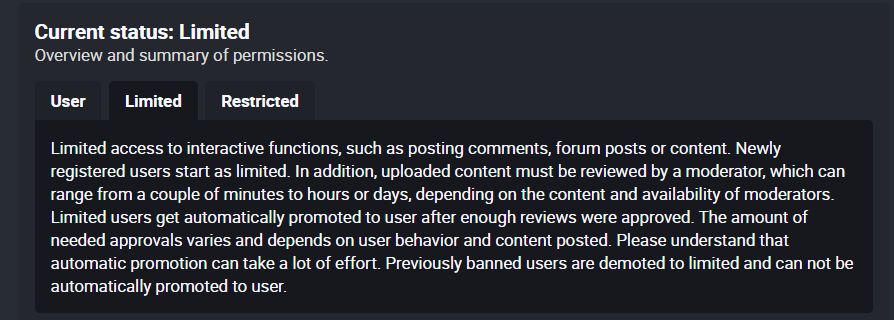 >>7940674 Юзер. Но опять же не припомню, чтобы специально что-то делал для повышения, как и саму эту дурацкую систему. Видимо новодел. Если возможность комментировать не отключена полностью, то попробуй оставить несколько комментов под разными видео (лучше на инглише), похвали чье-нибудь поделие. Скорее всего дело пойдет быстрее, если увидят что ты живой пользователь, а не бот какой-нибудь.