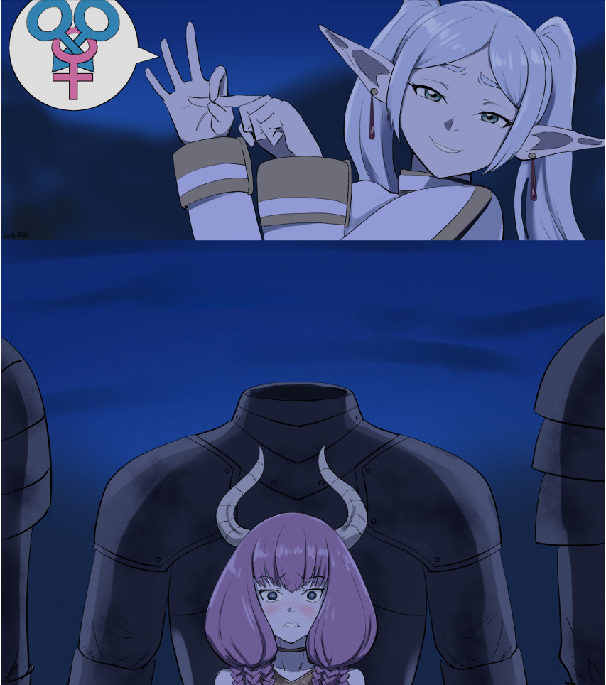 Не забывайте: ГГ Химмель умер ещё до начала истории. Ему, конечно, подрезали альфоватости в угоду сюжету (иначе бы он там всех выебал и было бы DNA^2, а это очень старое аниме), но именно он был норм в социальном плане. Хайтер тоже ок.