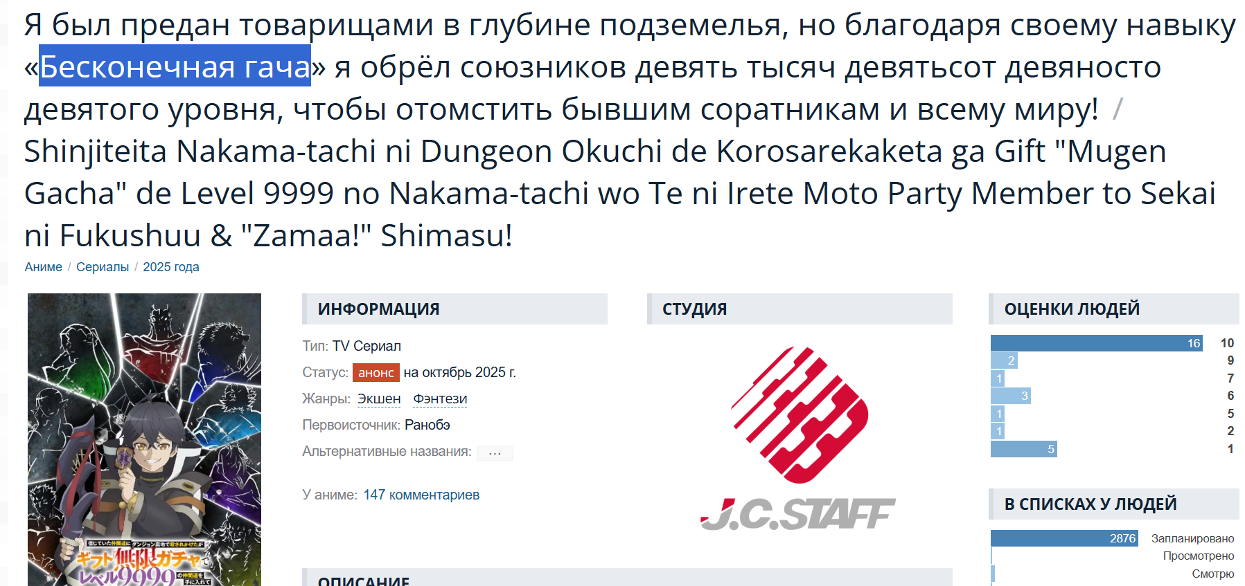 Ещё посмотрел поднятие хуя в одиночку, восхождение на хуй, хуй целитель, Wajutsushi, в каждом из этих аниме было что-то, что понравилось. В поднятии внезапно интригующий лор завезли, целителя просто смотреть забавно как треш, в восхождении есть смешные\занятные\красивые моменты, но хз, все пишут про какую-то ниибацца иронию по отношению к жанру, но её там не так уж и много. Понятно, что это всё в известной мере селфинстёртная параша, я и сам хз, чё меня дёрнуло, но обычно подобные аниме после нескольких серий дропаю, а эти не.