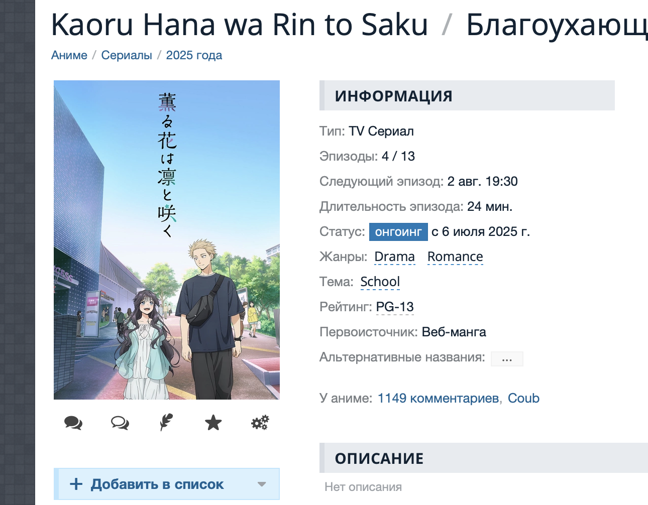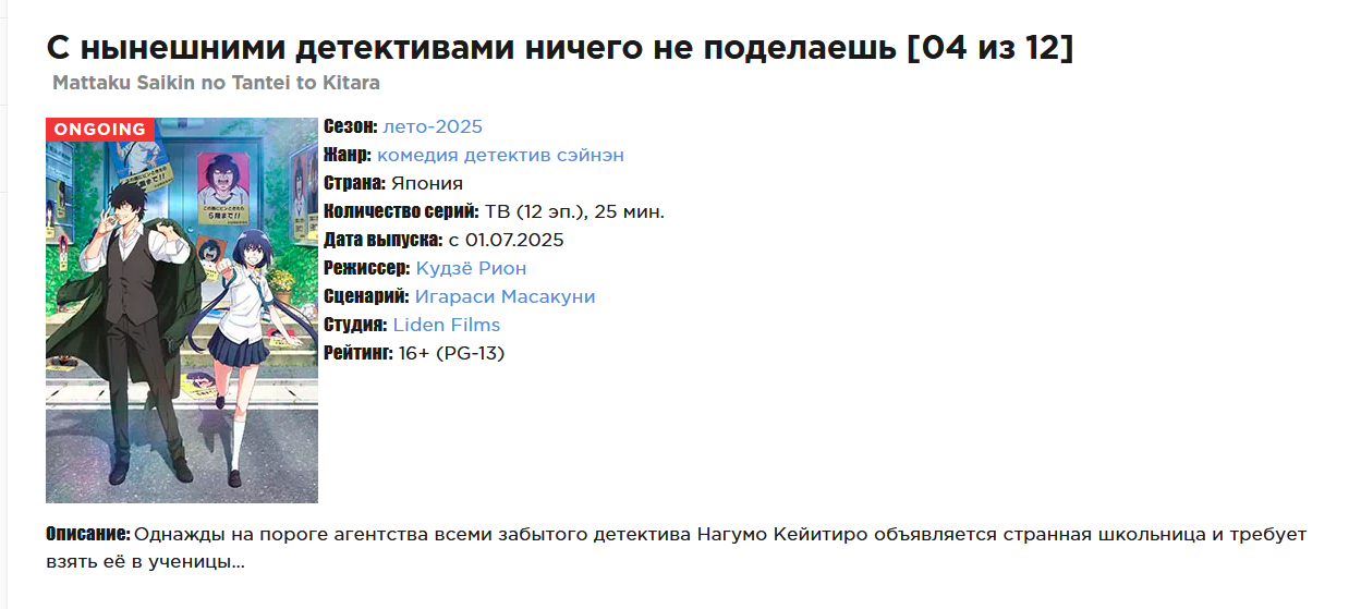 Досмотрел. Годнота. Такой анимы бы побольше, про взрослых людей, ромком, но без детских кривляний, история и персонажи, в которых веришь, без филлерокала на 3 сезона, лаконичная настолько, что серий даже не 12, а 10. 8/10